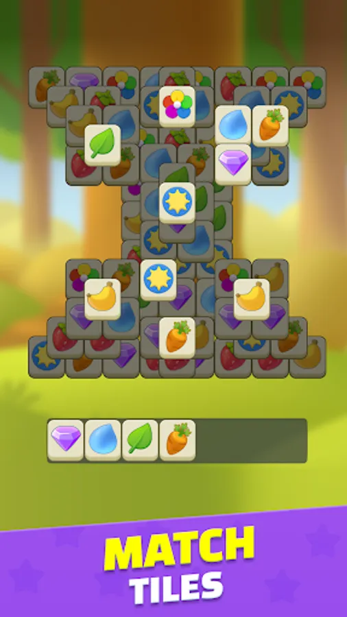 💪 Tap a tile and move it into the groove below. Once three identical tiles are collected in the groove, they will disappear.