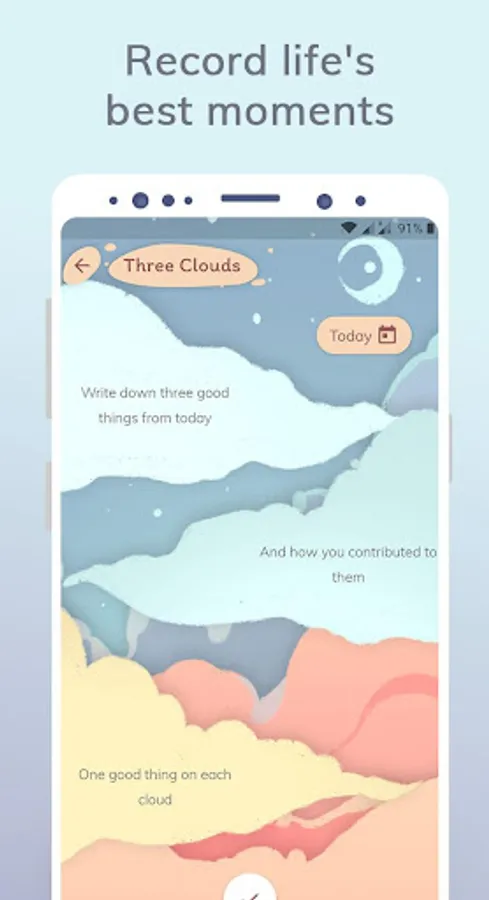Three Clouds is based on the gratitude journal from Positive Psychotherapy. By writing three good things each day the aim is to reduce worry, improve self-esteem, help cope with stress, and more.