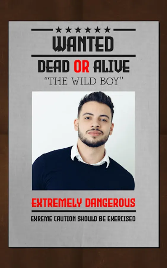 Do you want to see you yourself on a wanted poster? Do you want to see your best friend looking like a notorious criminal? Check out our Wanted Poster Maker Photo Editor that can make you laugh for hours! It is simple to use - choose a picture from your photo gallery or take a new photo with camera. Select your favorite photo designs to generate your amazing stylish photo. Then you can customize photos by using a variety of “wanted photo frames” and adding text on it. Make a perfect wanted photo frame for your friends and have endless fun with this amazing “wanted poster maker”!