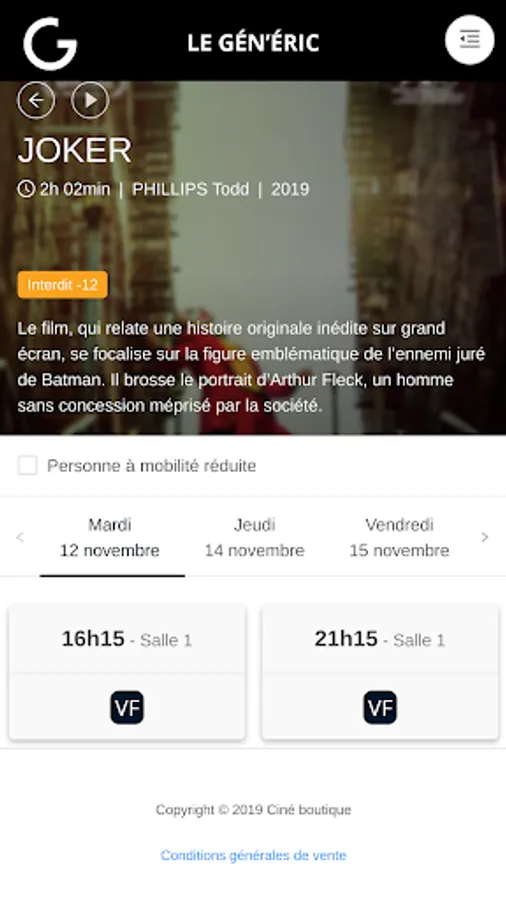 The Héric Gen'eric application allows you to reserve your seats in the Gen'eric cinema in Héric, with the possibility of paying by loyalty card.