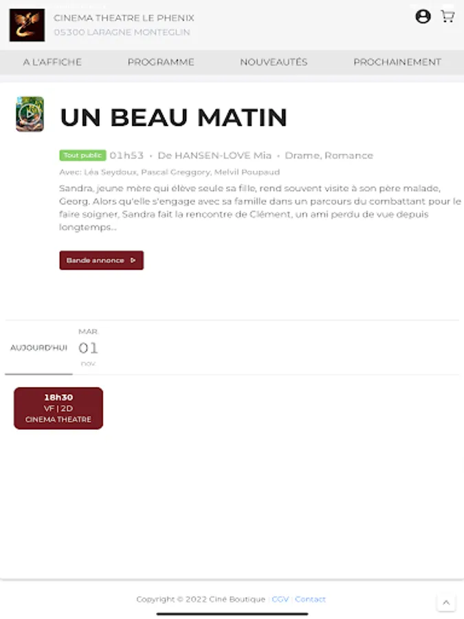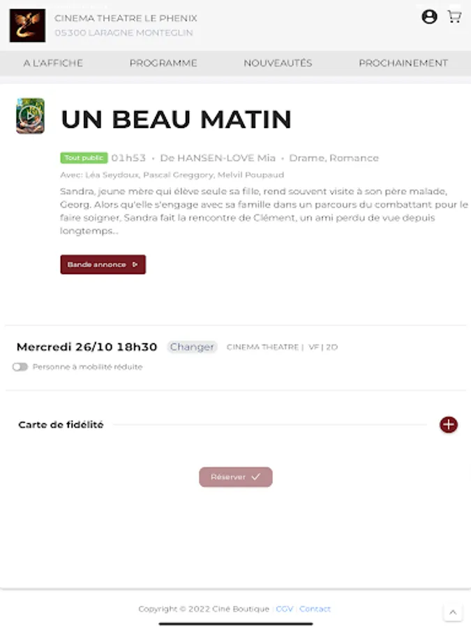 The Cinéma Théatre le Phenix application allows you to reserve cinema and theater seats in the Phenix cinema in LARAGNE MONTEGLIN