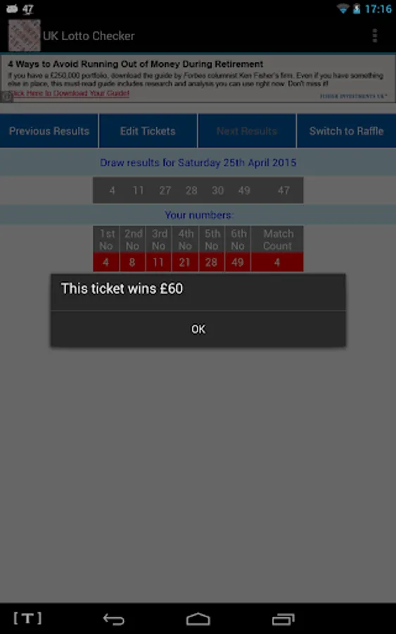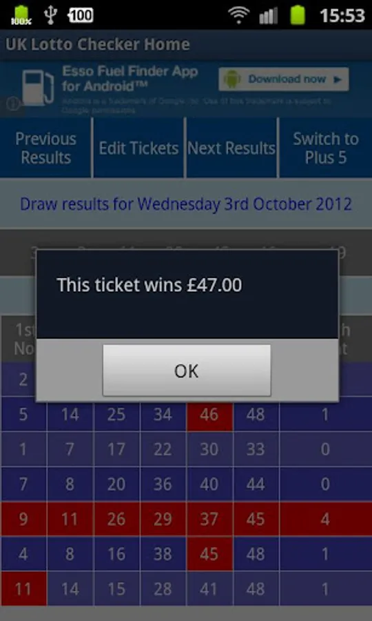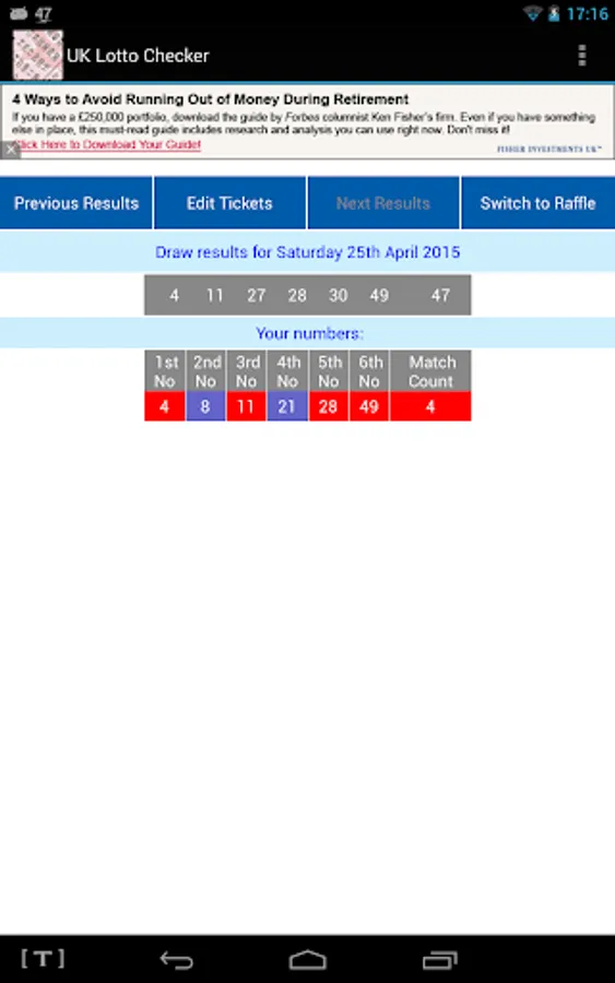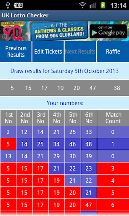 No need to plough through screens selecting which Lottery you're playing - this app opens with your list of UK Lotto ticket numbers and shows how many have matched alongside each ticket.