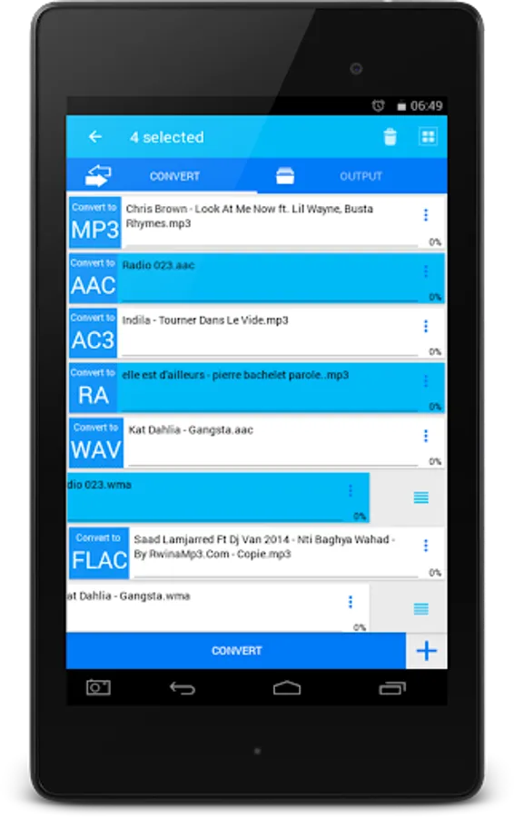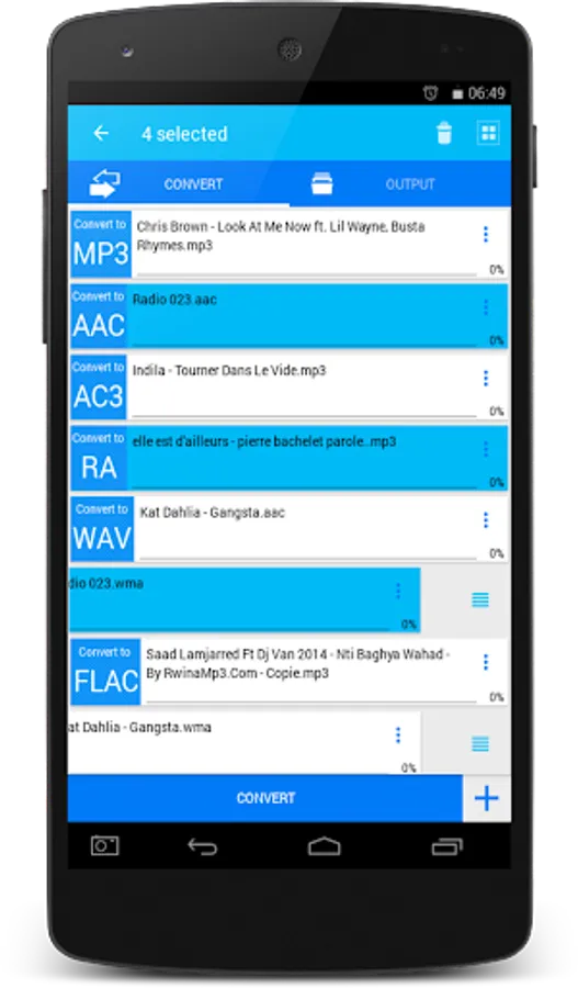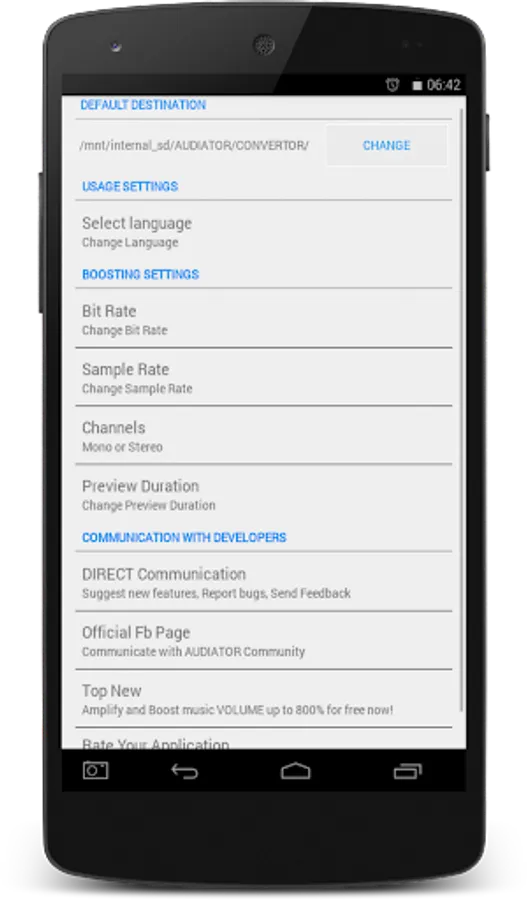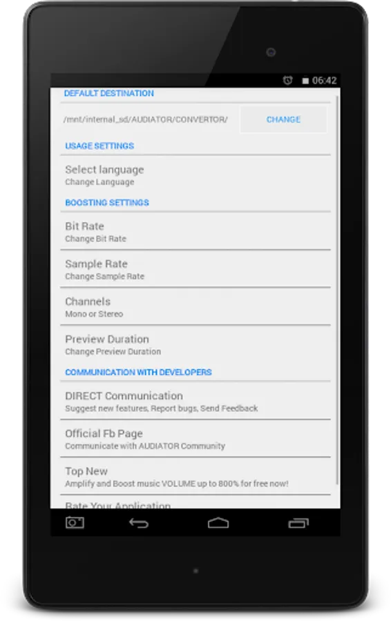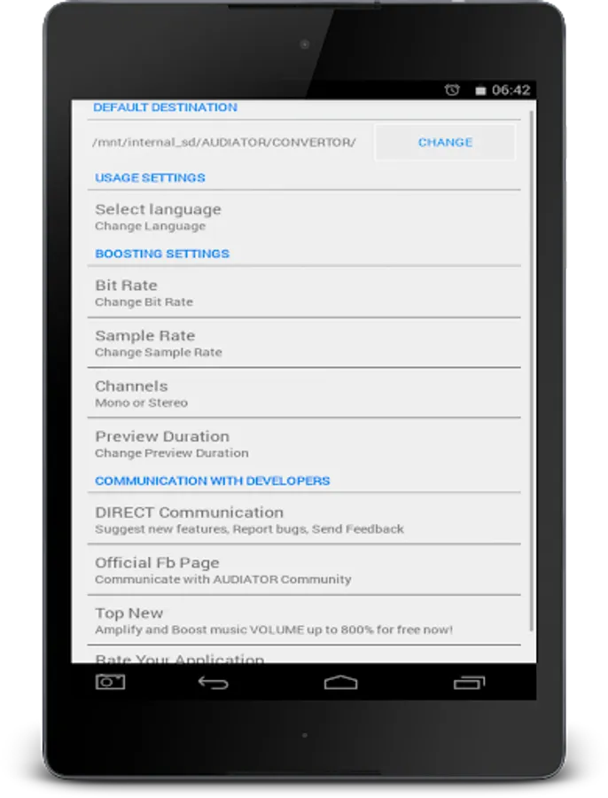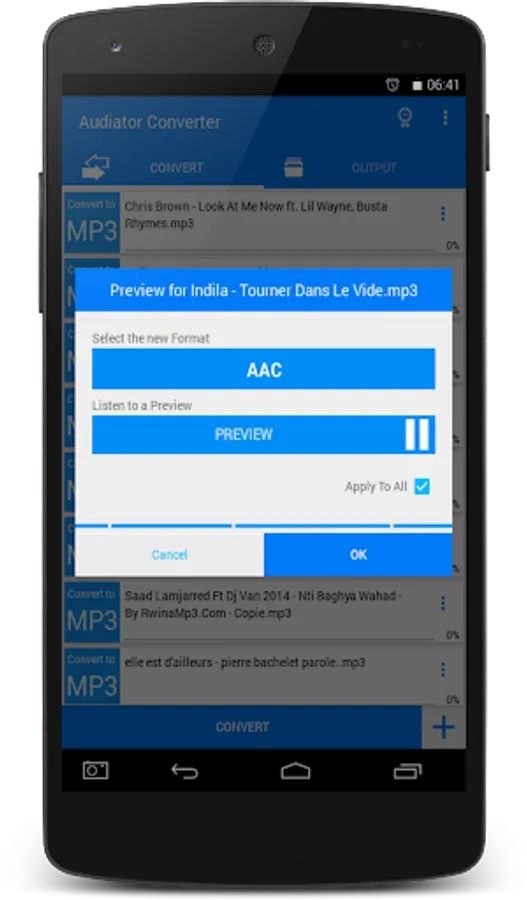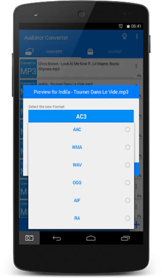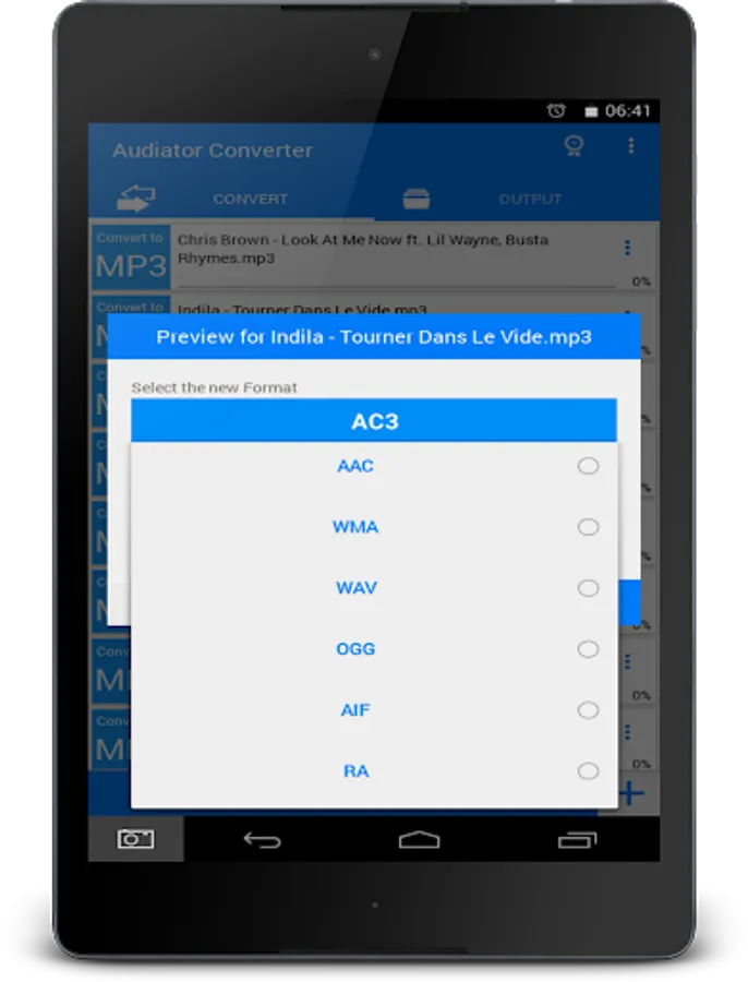 AUDIATOR the mp3 volume booster for android have a very simple user experience, with only three steps, you can search and convert all the audio aac, ogg, aif, aiff, wav, ra, flac, wma, ac3 and all video rmvb, flv, avi, mov, mp4, m4a, 3gp, 3g2, mj2, mkv, wmv, webm, Divxmusic within your android phone to give your headphone and speaker the prefered format sound: