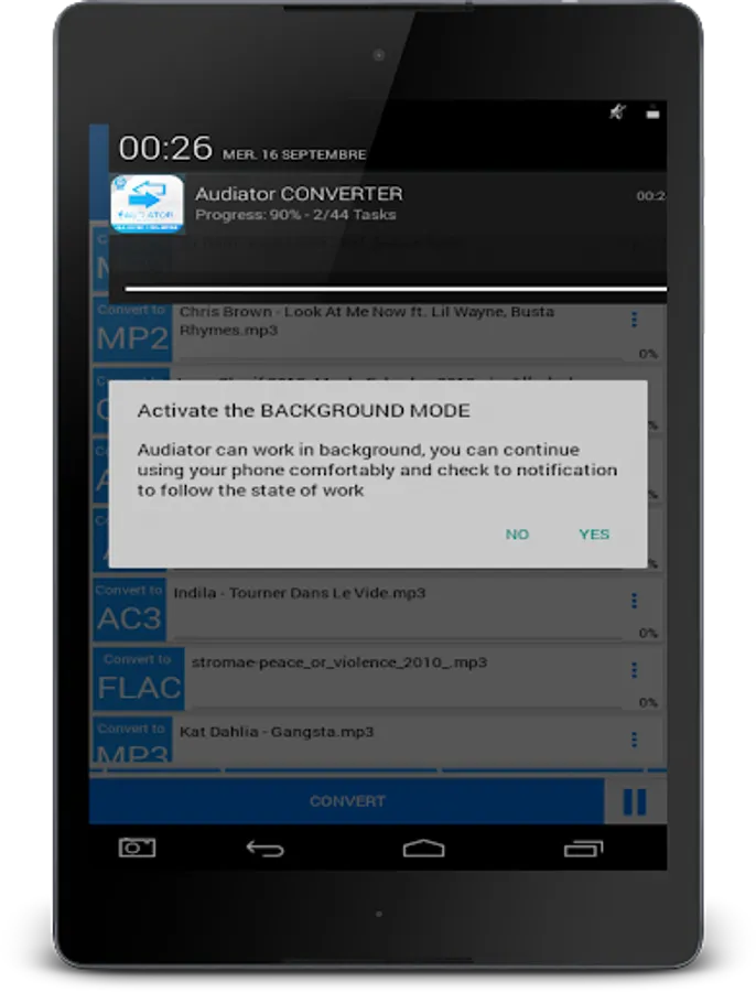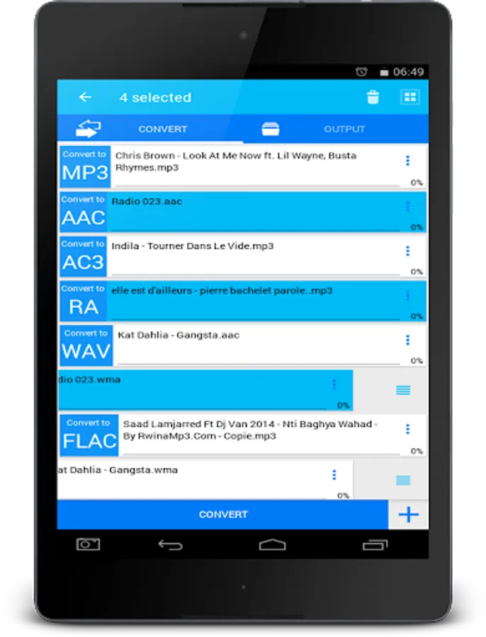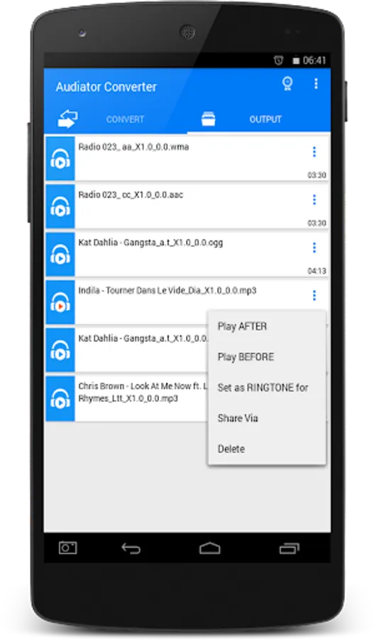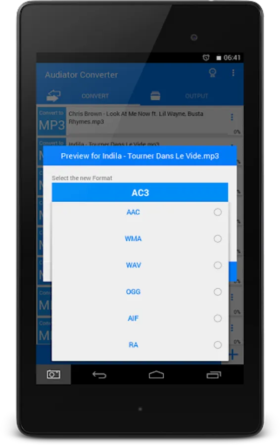 AUDIATOR mp3 converter for android is a sound app that give new format music to your headphone and speaker based on the famous library ffmpeg.
