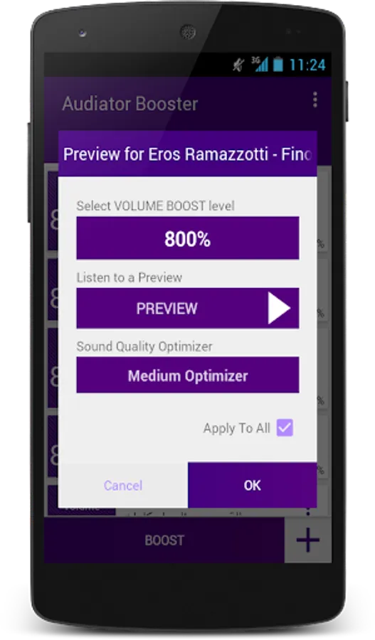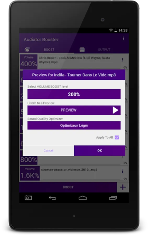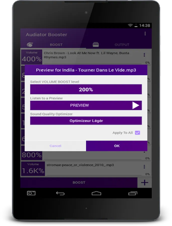 AUDIATOR BOOSTER is a powerful audio management, gain tool and mp3 volume booster for android, which amplify the volume of your mp3 , mp2 , wma , ra , ogg , aac , ac3 , wav , flac , aif , ogg music , audiobook , ringtone , records in any length and with a variety of options and pass your headphone and speaker limits and get a loud sound.