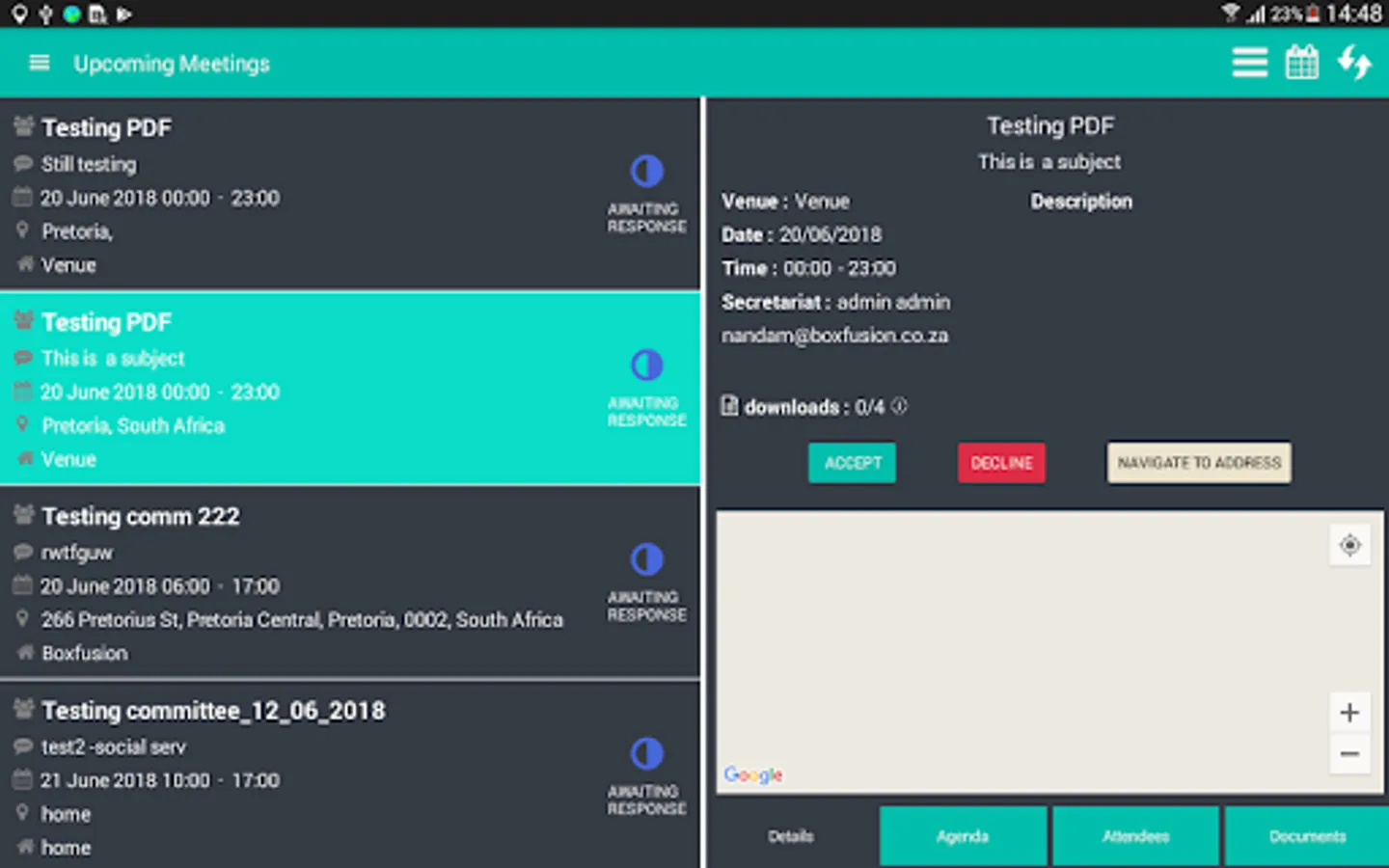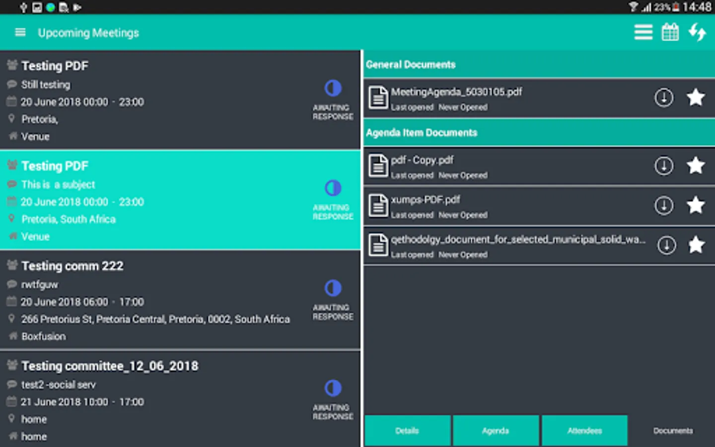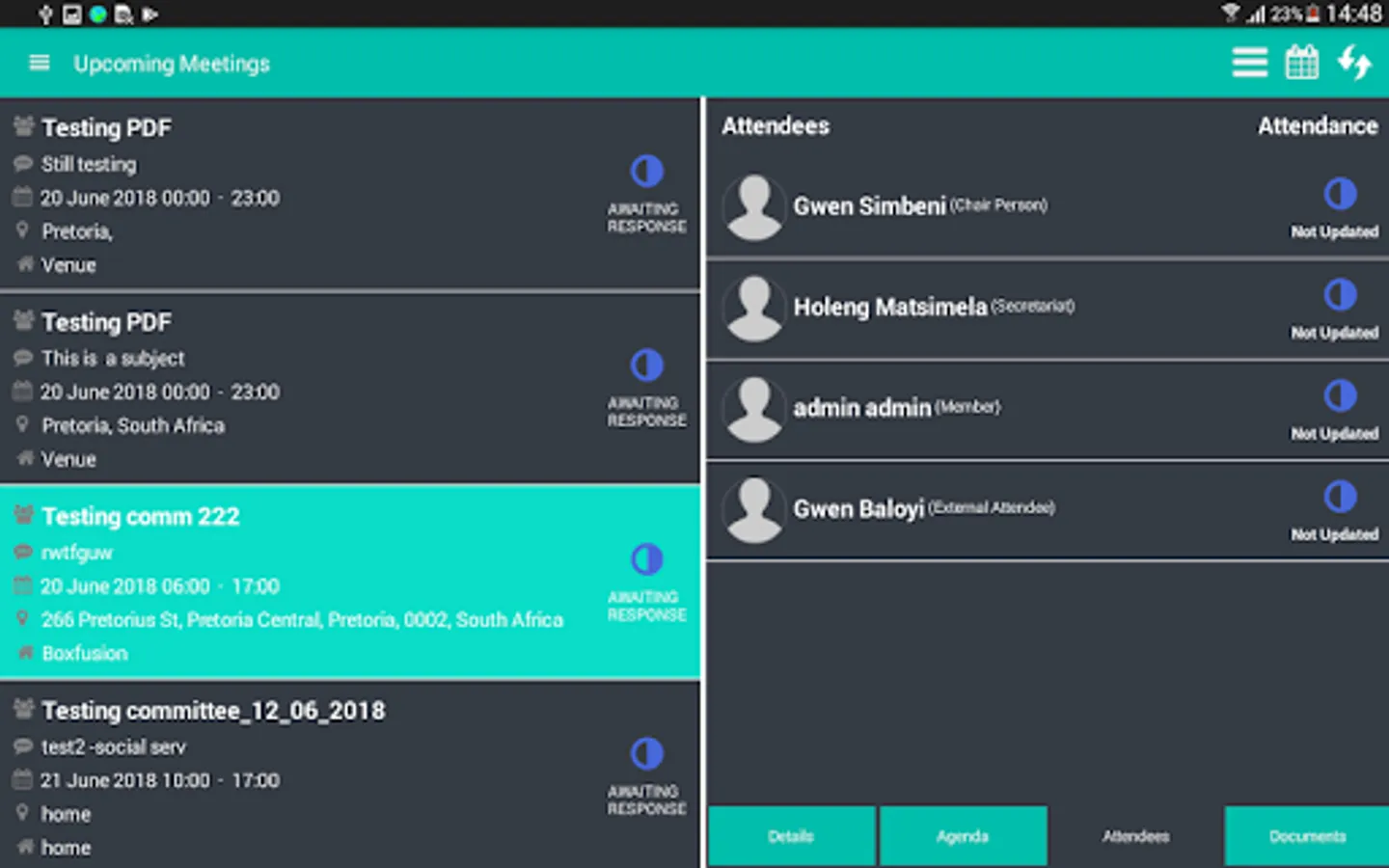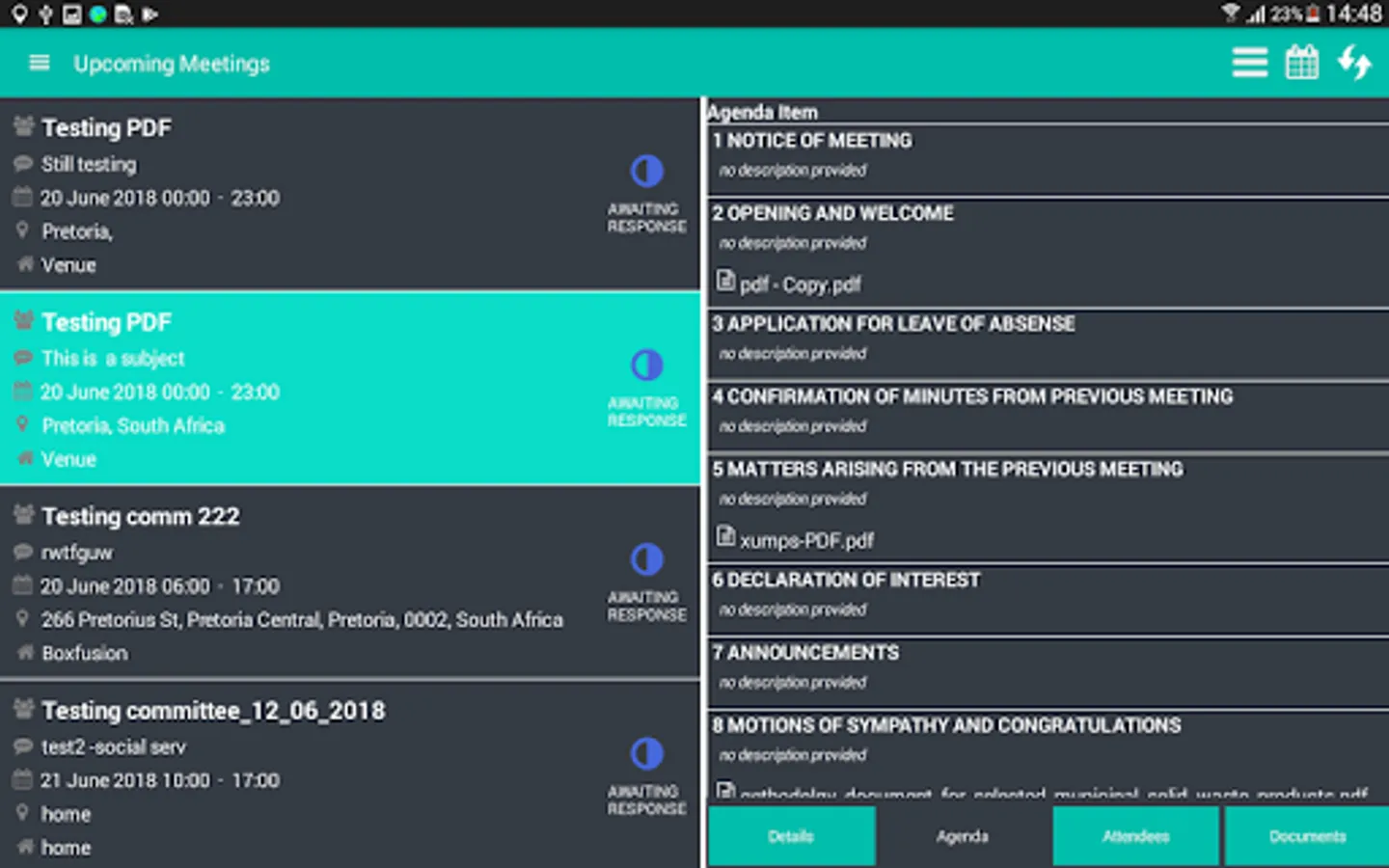 This application is about committees , inside the committee there are members which are going to be invited for the certain meeting and those members will now be called attendees in the meeting . App generates an agenda and meeting details for the meeting