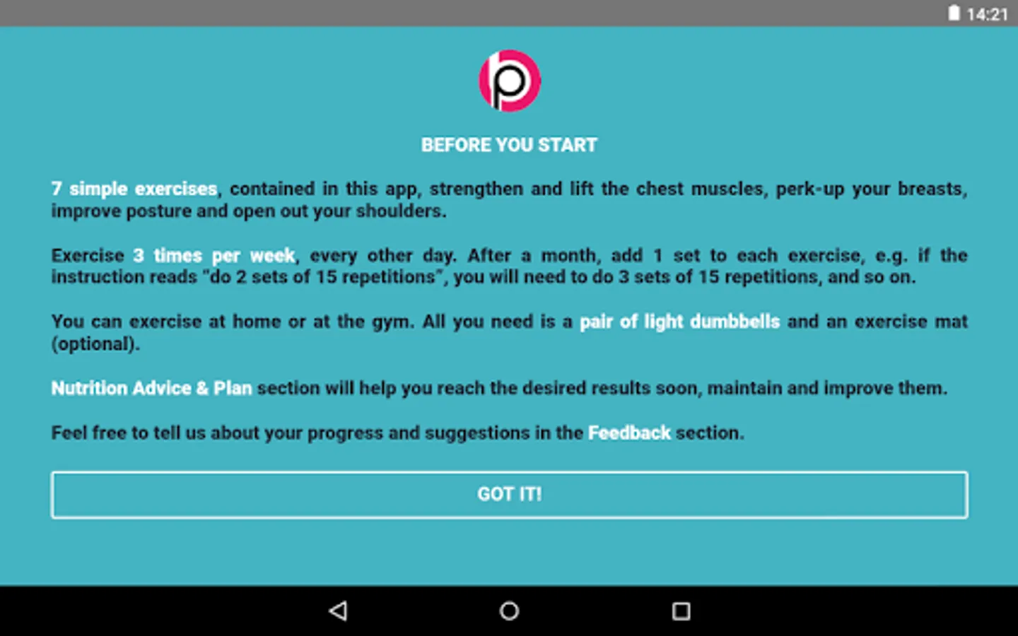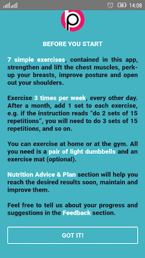 You will need to exercise 3 times per week, every other day. Usually the results can be seen in a few weeks. Having reached the desired results, keep exercising further to keep the chest, back and shoulder muscles toned up.