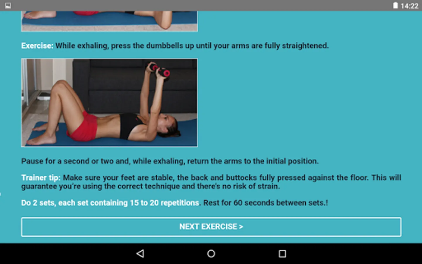 After a month, add 1 set of each exercise to your routine. For example, if the instruction reads “do 2 sets of 15 repetitions”, you should do 3 sets of 15 repetitions, and so on.