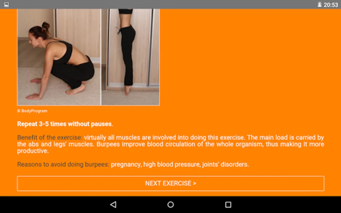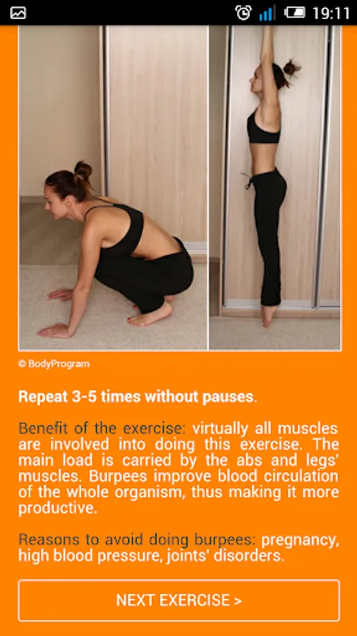 You can do it every day and even several times per day as soon as you feel the need for an energy boost. The whole set takes around 5 minutes to complete. No need to rest between exercises – just do them one by one without pauses.