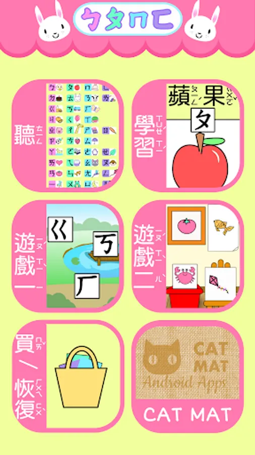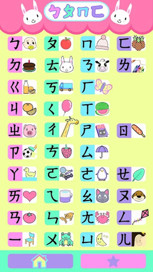 A bpmf(bopomofo) app designed for babies toddlers and children. This app teaches children Chinese pronunciation with zhuyin fuhao and basic Chinese vocabulary with fun games. It includes original high quality voice recordings and art created specifically for this game. This is an educational game created by a teacher based in Taiwan.