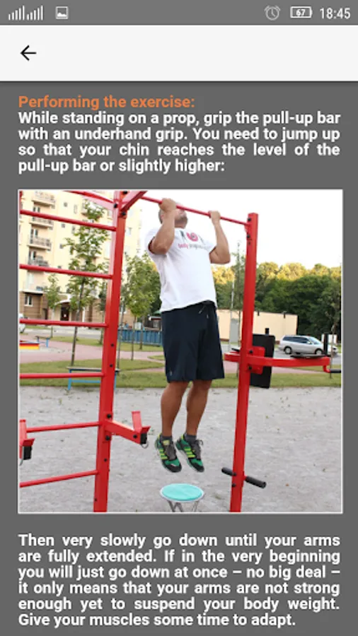 The second stage – negative pull-ups. You will jump onto the pull-up bar and lower yourself slowly.