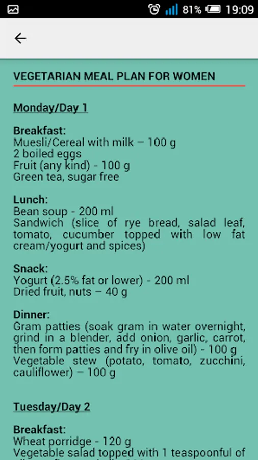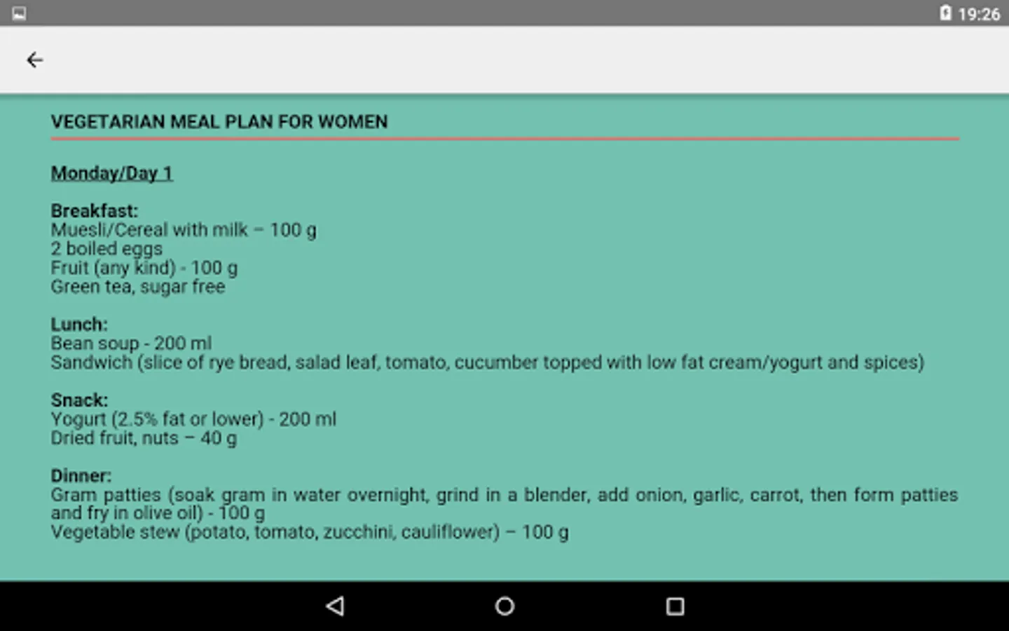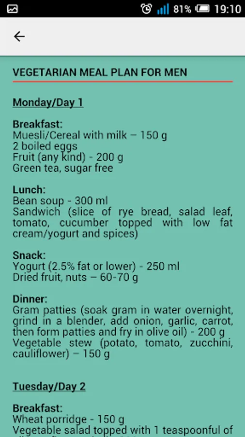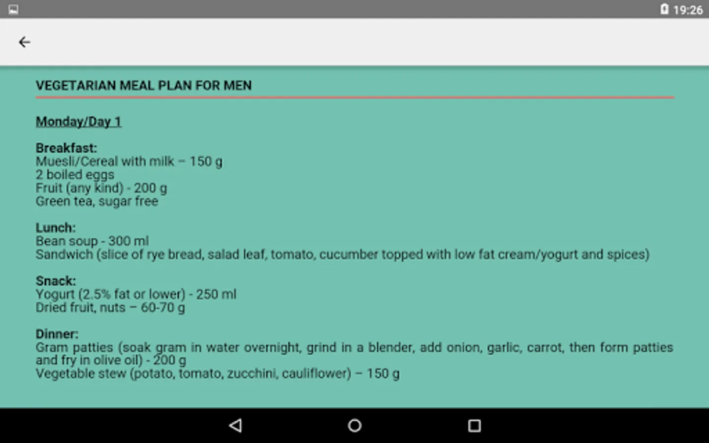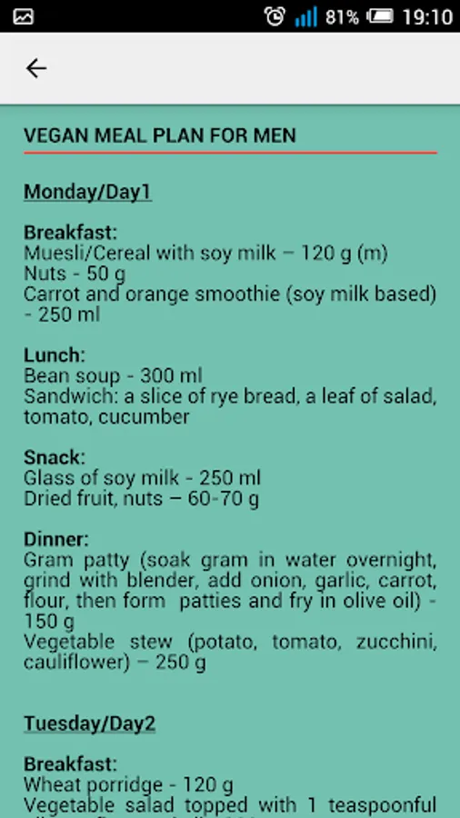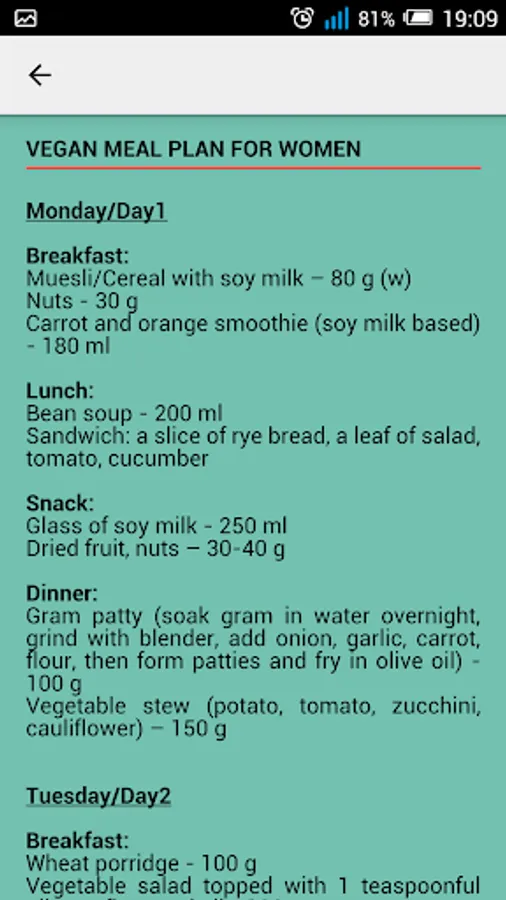- Dedicated one week diet plans for men and women further separated into vegetarian and vegan categories