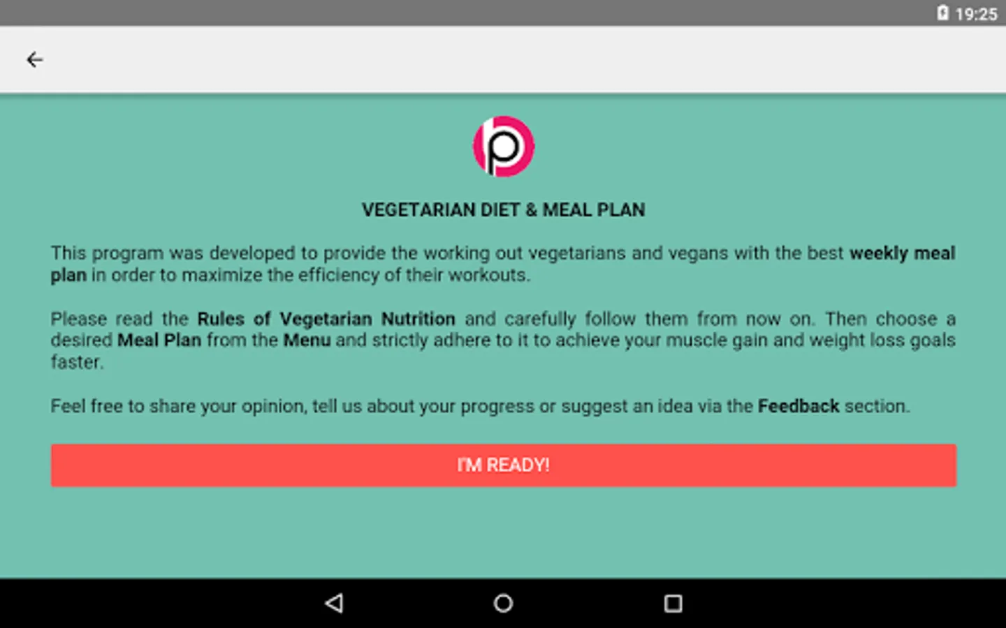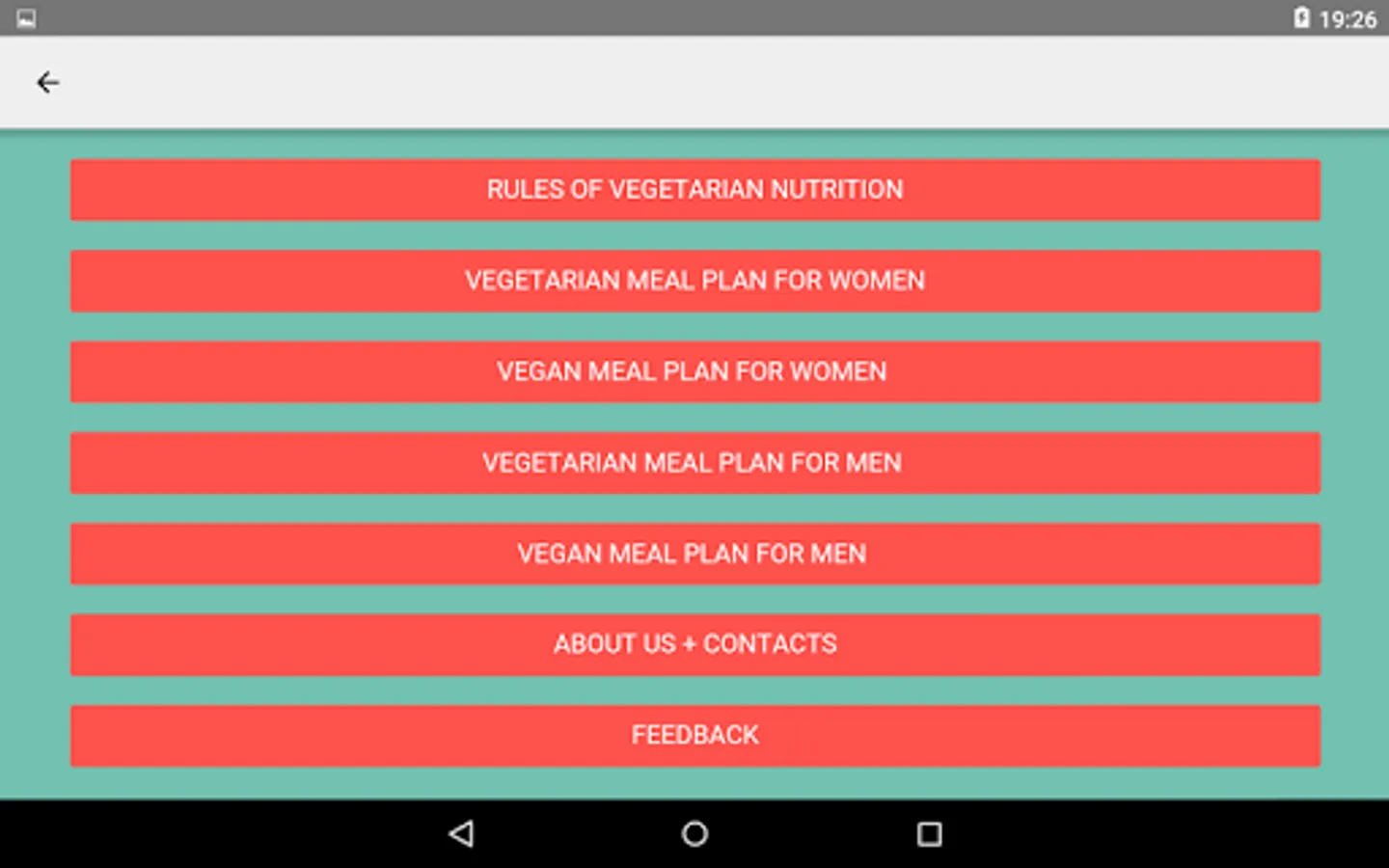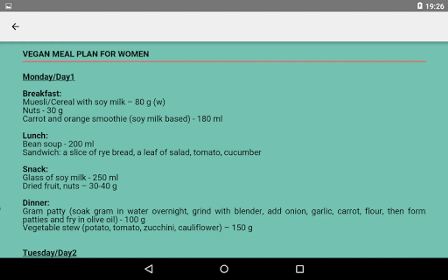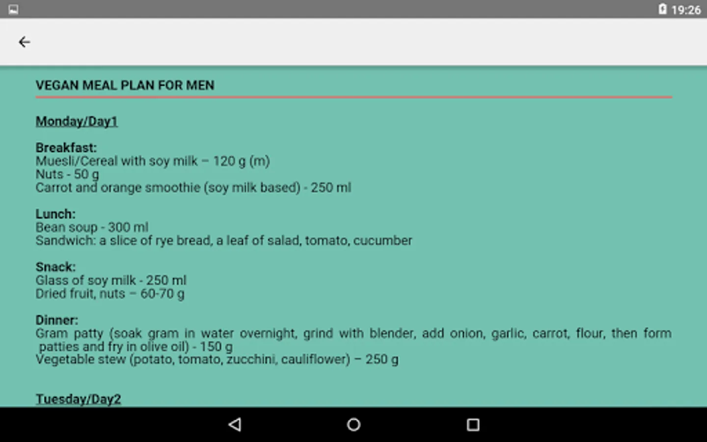 - Dedicated one week diet plans for men and women further separated into vegetarian and vegan categories