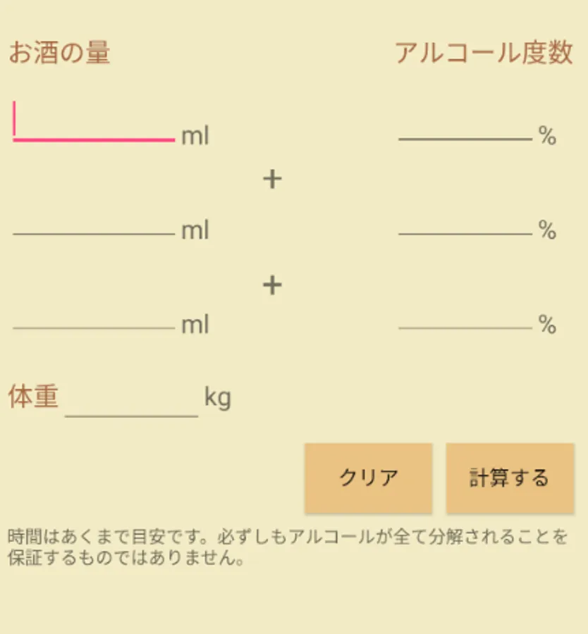 The amount of liquor, alcohol content, and press the "Calculate" enter your body weight, to display the time that alcohol is broken down in the body.