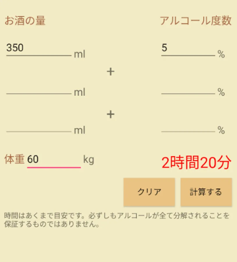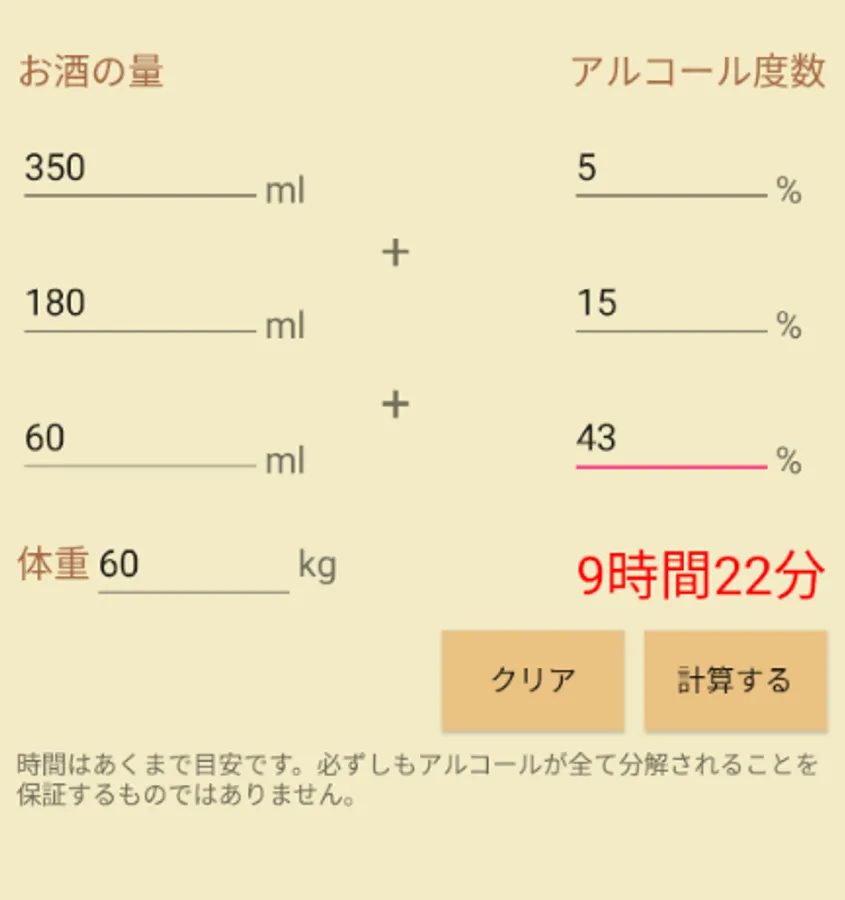 Such as beer and sake, also it can be calculated in accordance with liquor that alcohol content is different. In that case, the time displayed is the sum of the time.
