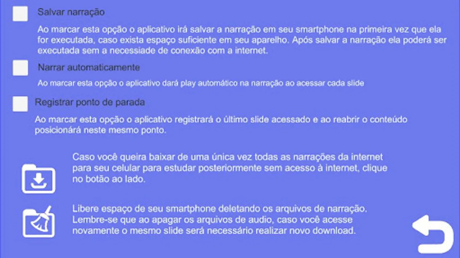 The application allows you to previously download all the narrations of the slides to your smartphone, which will allow a study completely offline and without the need for internet.