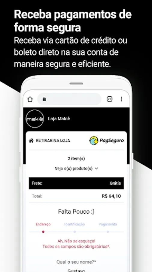 Presentation: This application is an extension of the Makiê online store for consultants who have a PagSeguro account, and is available for Android and IOS. With it you can share products, send payment link and manage customer orders via Smartphone.