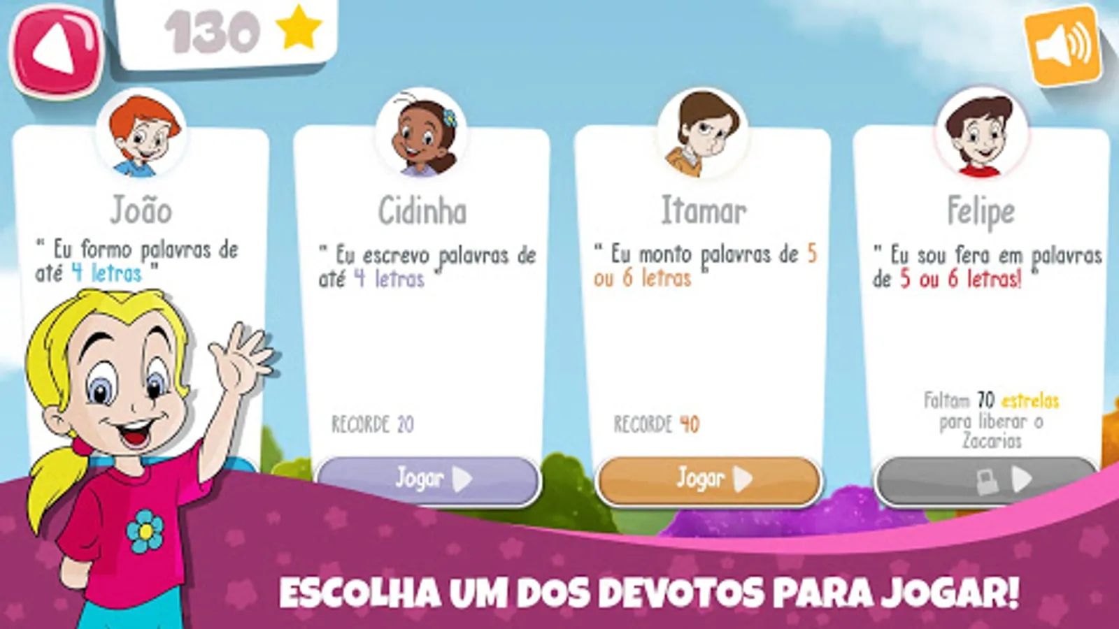 O aplicativo inicia com o personagem João desbloqueado. Na sequência vem