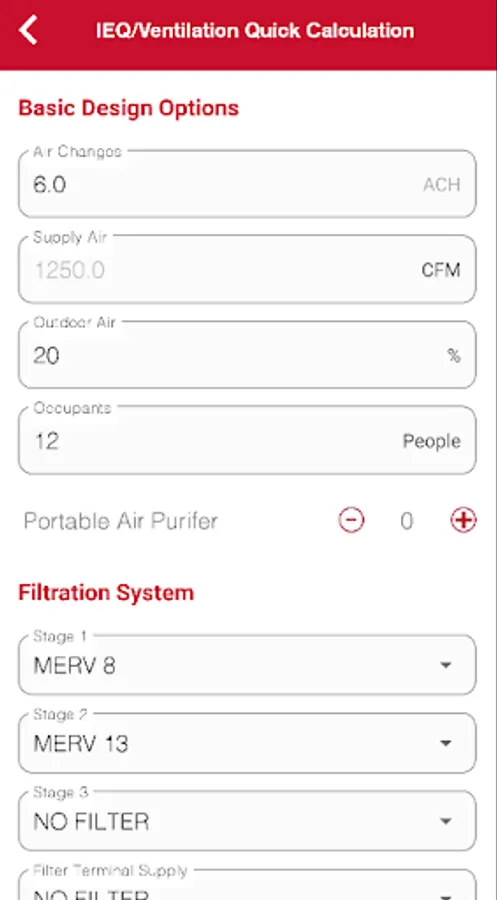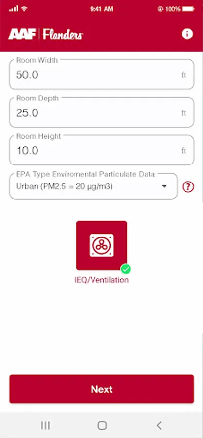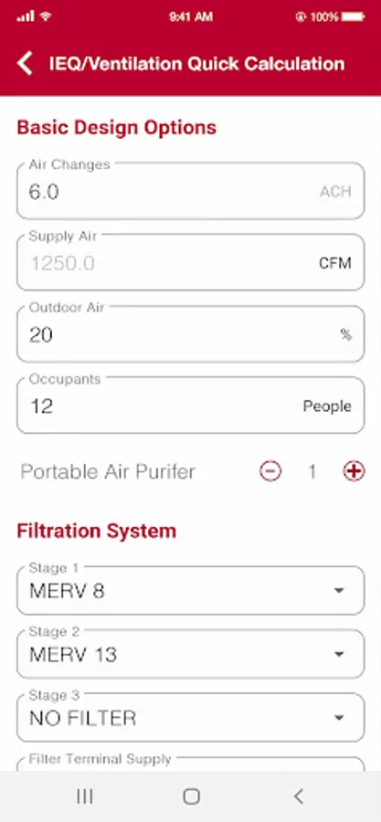 The VisionAir IEQ app is an easy-to-use calculator tool derived from the VisionAir IEQ software. As in the full version of the software, the app uses a state-of-the-art calculation method based on air filtration expertise gained over a century of bringing clean air to life. The app allows a user to estimate the particle concentration within a space in a few simple steps. Calculations are performed based upon the entry of variables such as filtration efficiency, number of people occupying the space, internal contamination generation, and outdoor air pollution.