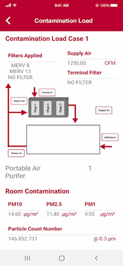 In this comparison, the app contrasts the particle concentrations in these scenarios using the same size ranges used by government agencies and the World Health Organization: PM 10, PM 2.5, and PM 1.0. In so doing, this simulation helps the user to identify the ideal clean air solution for a given space and set of circumstances.