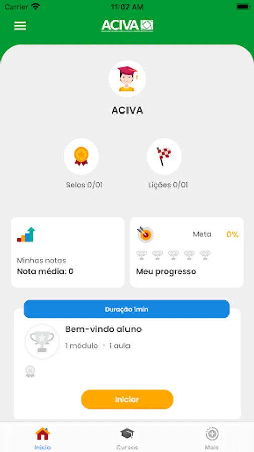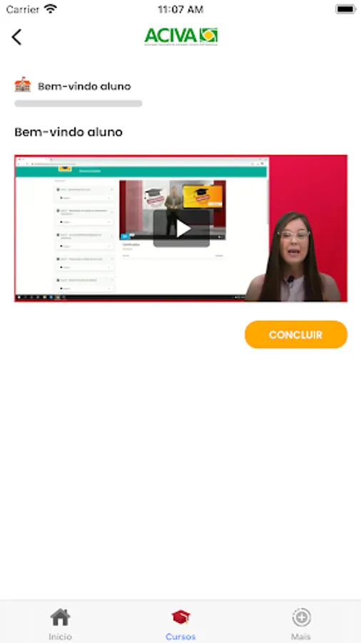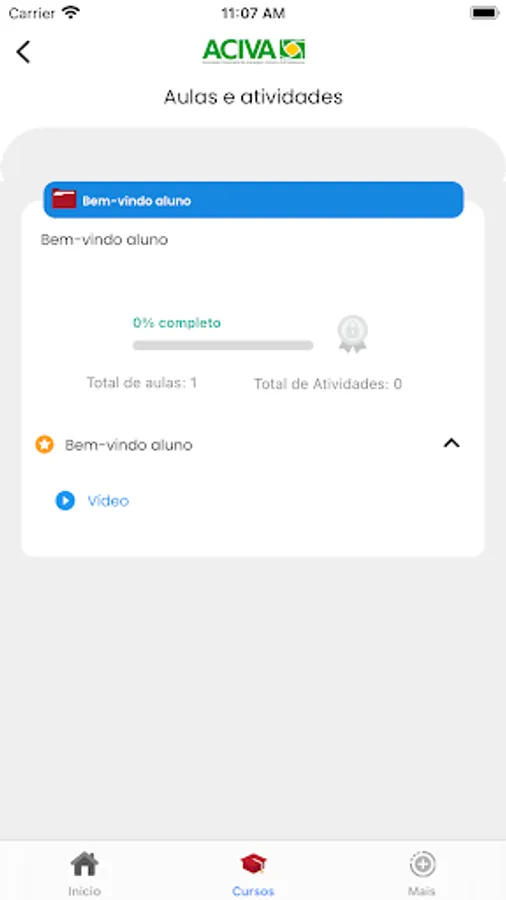 Dashboard area for monitoring grades and modules and listing courses. Possibility of viewing short videos and issuing certificates of completion.