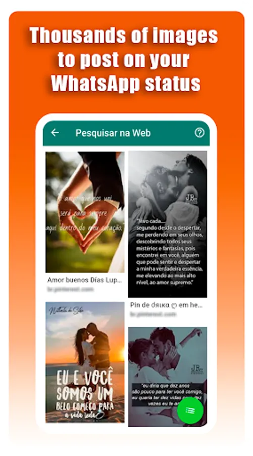 Create new Status from Camera, Gallery or use the "Search on the Web" option: There are thousands of Status for you to use them. To do it, just go to the drawer menu and select "Create Status".