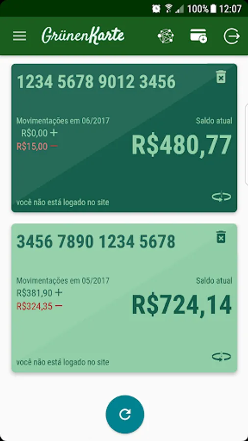 * Card screen: shows the current balance, the total benefits and expenses for the last month and the date and time of the last update check on the website;