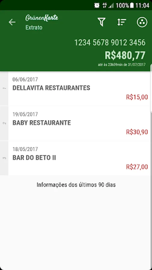 * Statement screen: shows the operations performed and allows data to be filtered (all, benefits, expenses, last month), ordered (date, location, amount) and grouped (location);