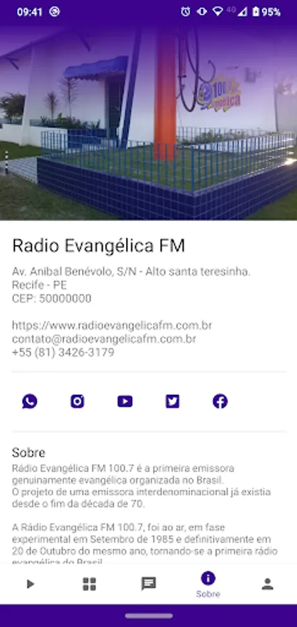 The Evangelical Radio 100.7 FM, aired in experimental phase in September 1985 and definitively on 20 October of the same year, becoming the first gospel radio in Brazil.