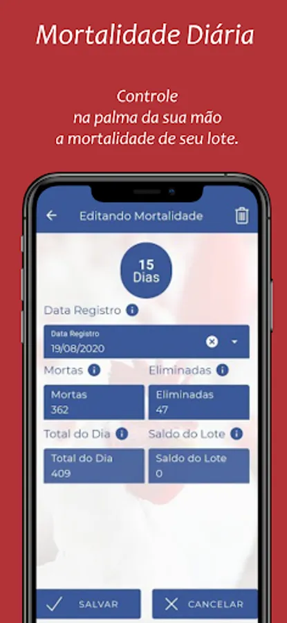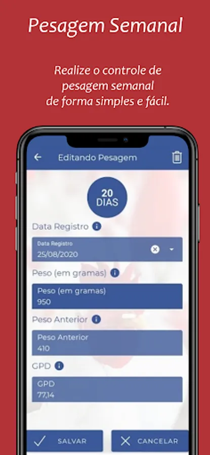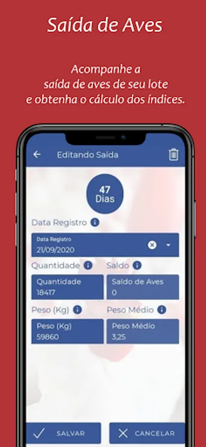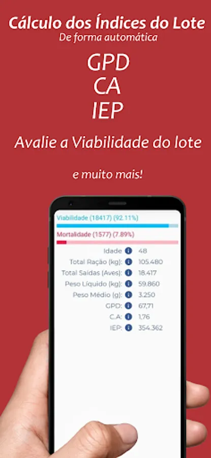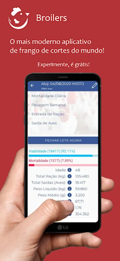 This broiler chicken application is intended for broiler producers to monitor the daily routine of the batches, recording their weekly weighing, daily mortality, feed input and output and their closing of the batch. It is possible to generate the indicators of IEP (Productive Efficiency Index), GPD (Daily Weight Gain), mortality percentage, feed conversion, average weight and many productivity indexes.