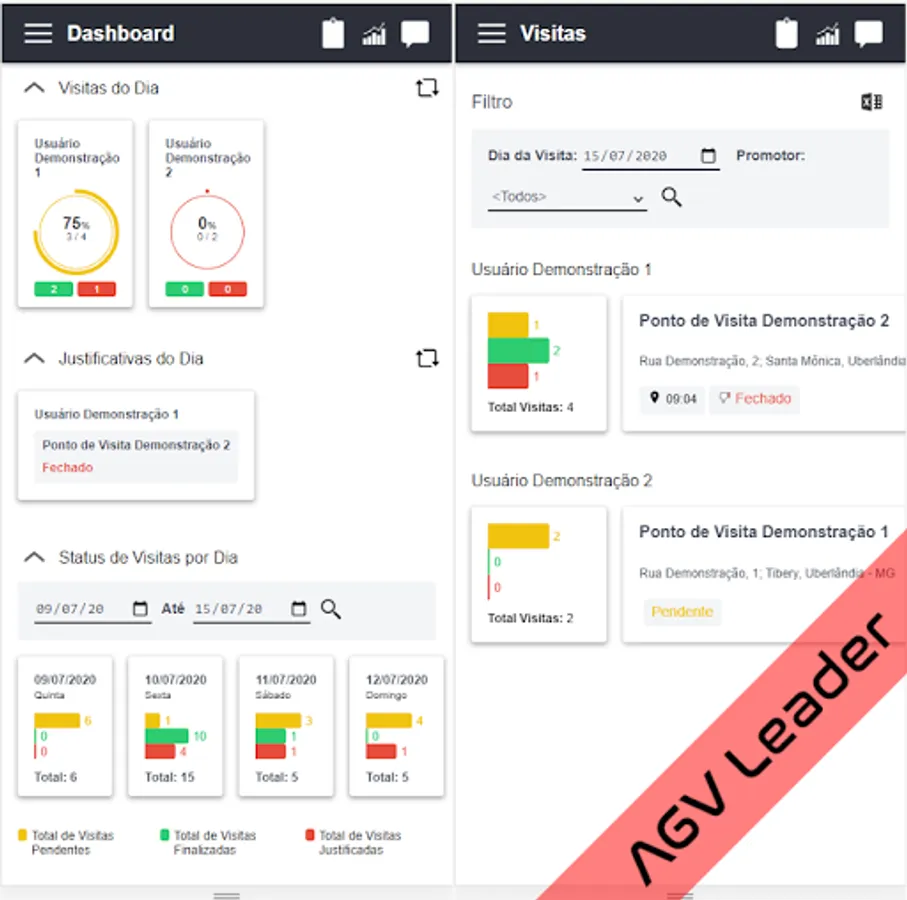 The collected data can be visualized through graphs and reports in the AGV Leader web application (application intended for the leaders of teams of visitors).
