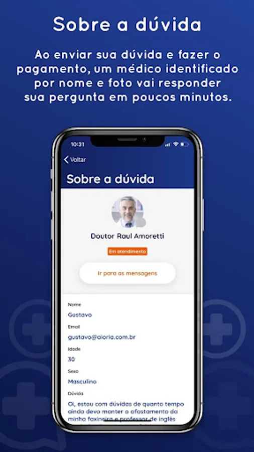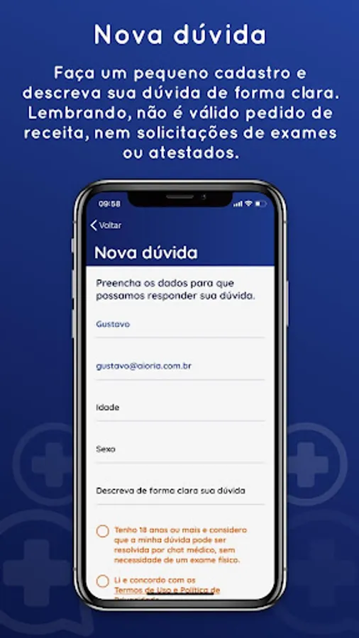 In order for you to have a better experience in our application, it is important to say that we are not offering teleconsultations, so you will not be able to send prescriptions, requests for exams or certificates, it will only give the guidance requested by you.