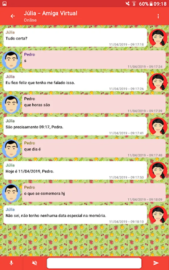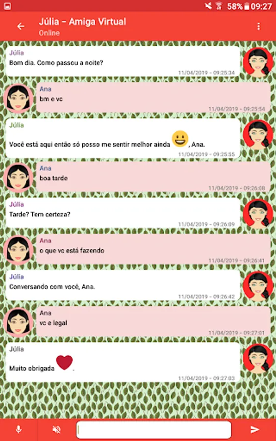 Júlia - Amiga Virtual is an application developed in Brazil that speaks Portuguese, being able to understand slang and abbreviations. It is safe and does not allow the use of offensive words. Anyone can chat with the app without worry about various subjects. The chatbot works offline, and conversations are not monitored, ensuring privacy and anonymity.