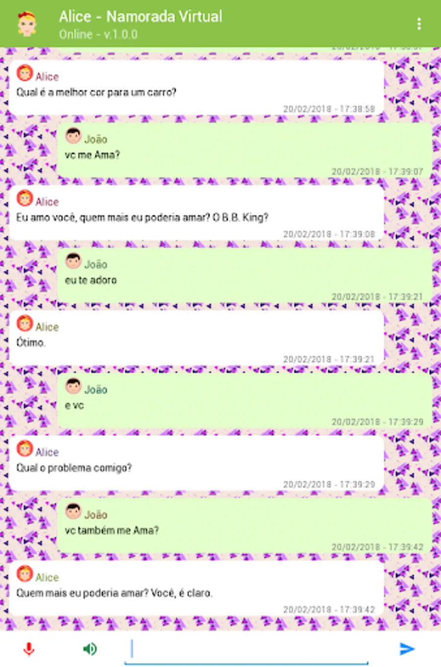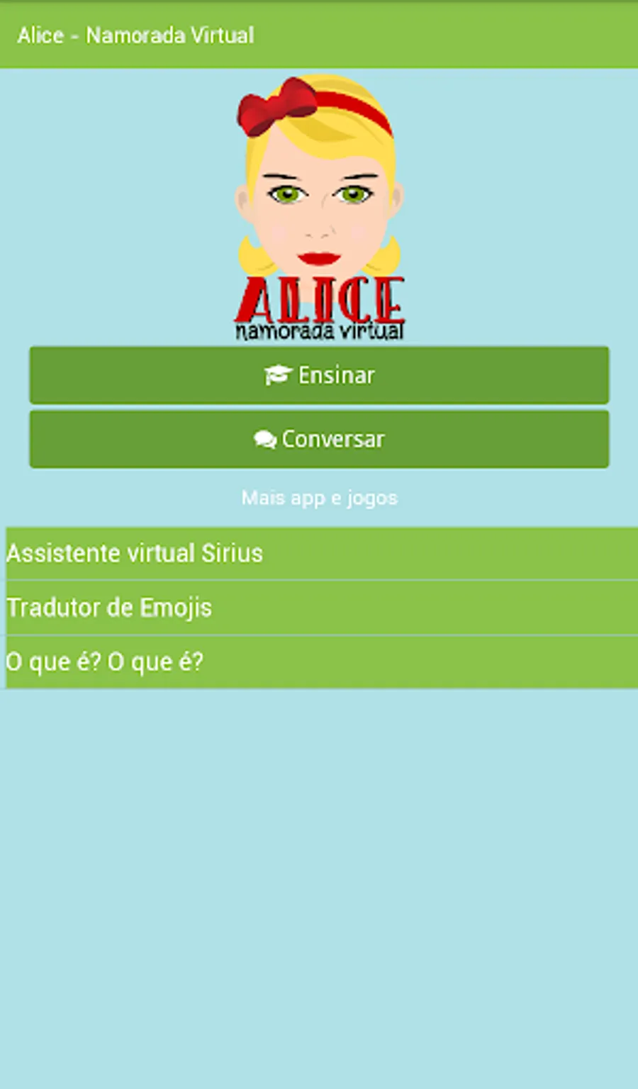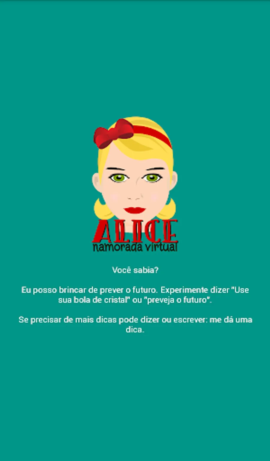 Alice is a virtual friend created for you to chat and have fun. It is also a chatbot in Portuguese capable of answering thousands of questions on the most varied subjects using artificial intelligence and programmed responses.