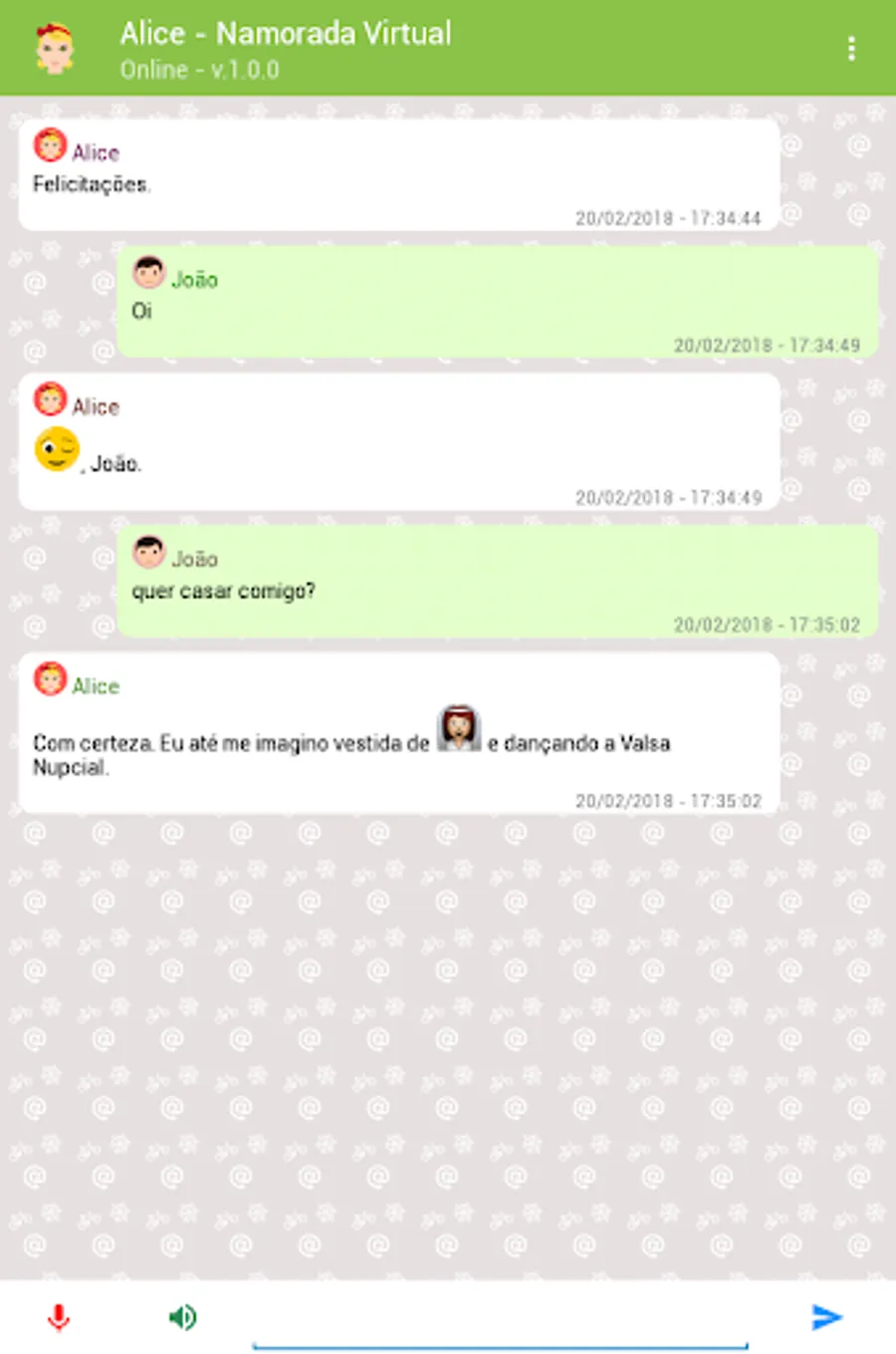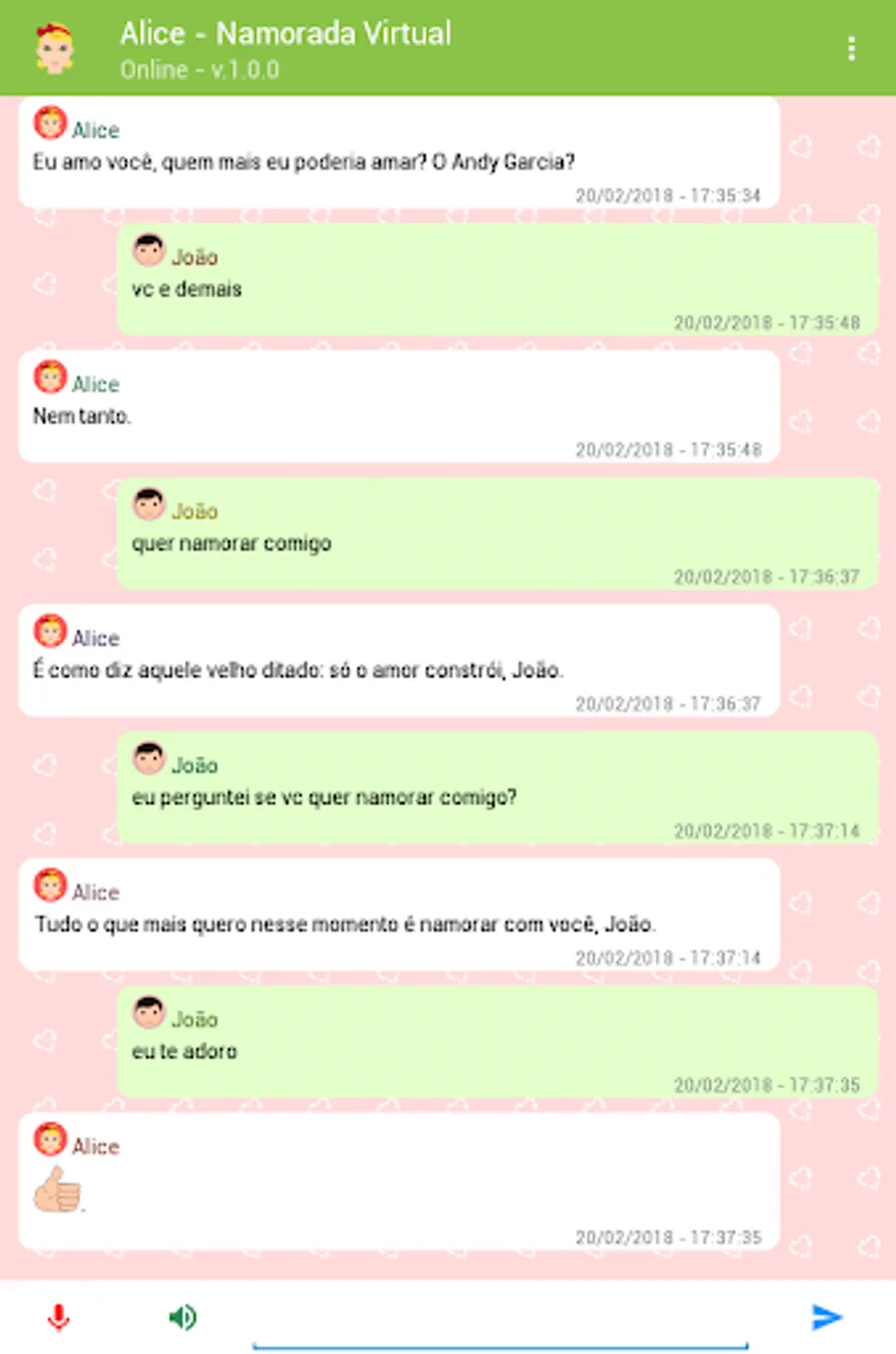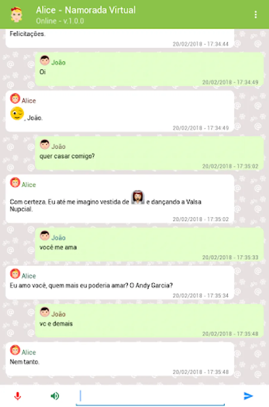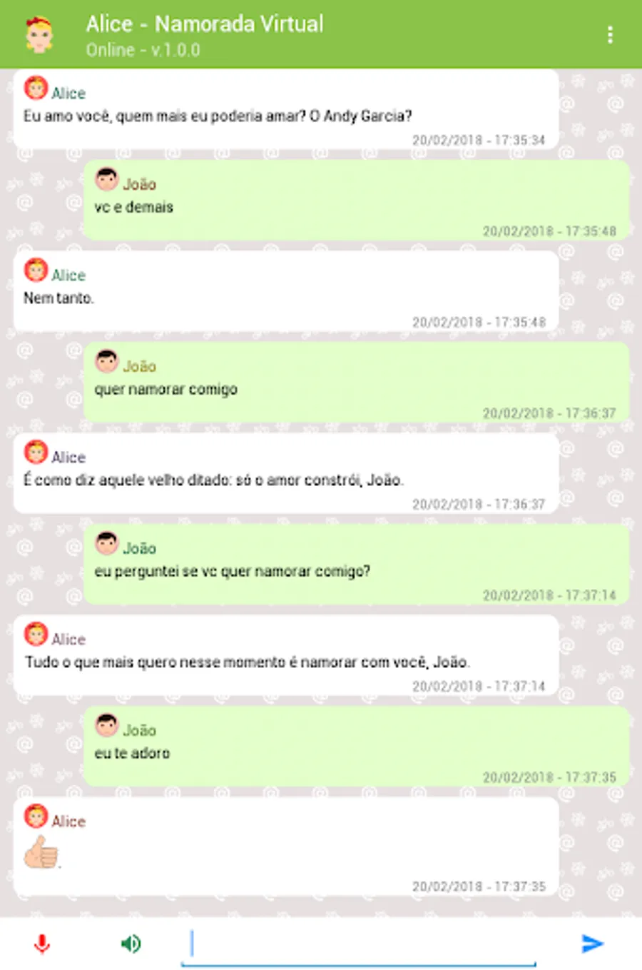 Alice is a virtual friend created for you to chat and have fun. It is also a chatbot in Portuguese capable of answering thousands of questions on the most varied subjects using artificial intelligence and programmed responses.