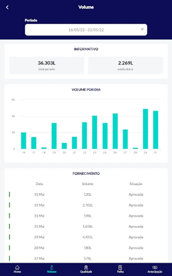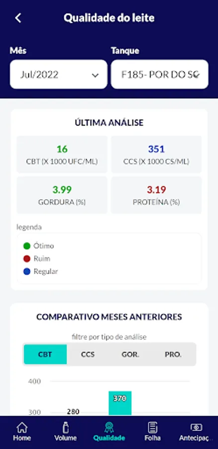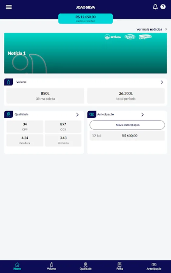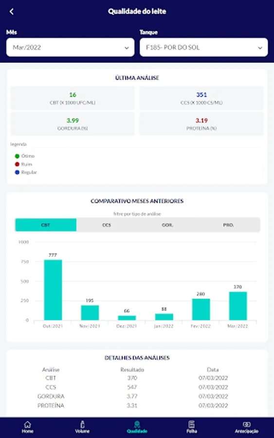 With the application, the producer is updated on his results in a simple and practical way, being possible to follow the volume of milk supplied, conclusions of the quality analyzes and the payment statement.