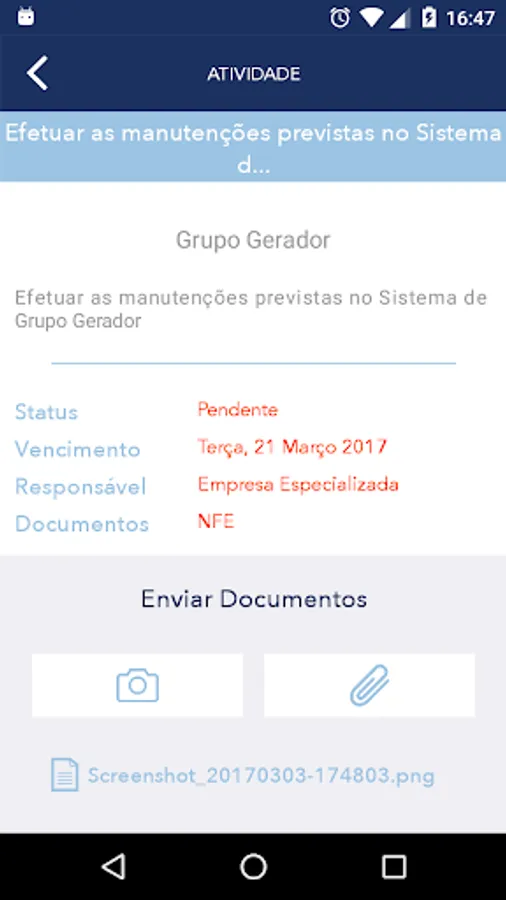 When the scheduled maintenance is performed, the user must register the application, and this information is automatically forwarded to the Acquiring Company and / or Construction. In cases where there is need for the maintenance be performed by Qualified Company or Specialized Company, the user must take a picture of the receipt of the performance of services under penalty of loss of collateral. This photo will be sent automatically by the application to the Acquiring Company and / or Construction.