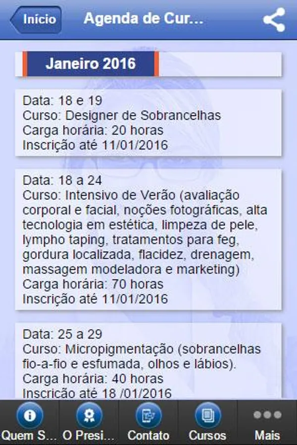 The portfolio of courses offered by the institution is extensive, among them are the courses: Improvements in Aesthetic Facial and Body, micropigmentation, electrotherapy, podiatry, Training in Aesthetics for Physiotherapists and others. annually hosts the largest Aesthetic Congress of the Holy Spirit and has a significant share of Espirito Santo Congress and national and international renown.