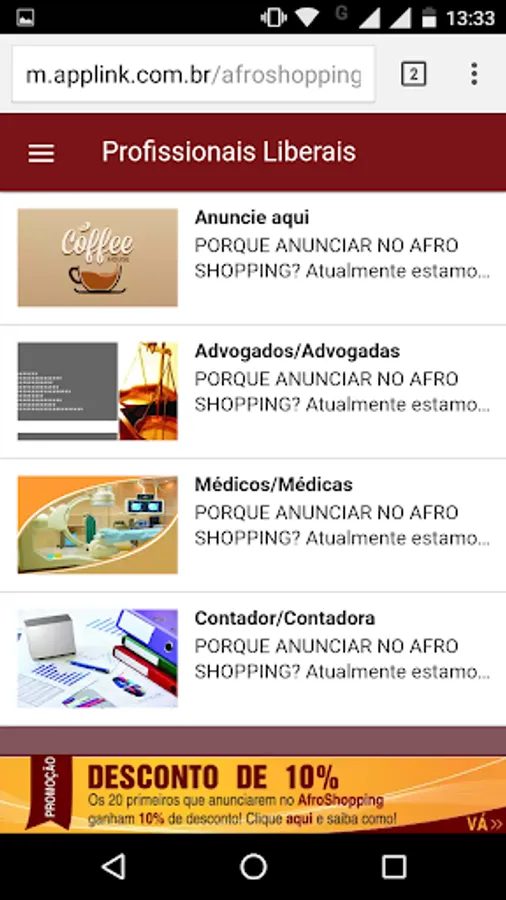 Afro Shopping offers at an affordable price advertising services in App. Through the application you can offer products and services, publicize events, form partnerships and inform their clients, friends and partners on promotions and new releases.