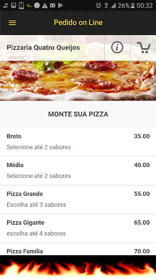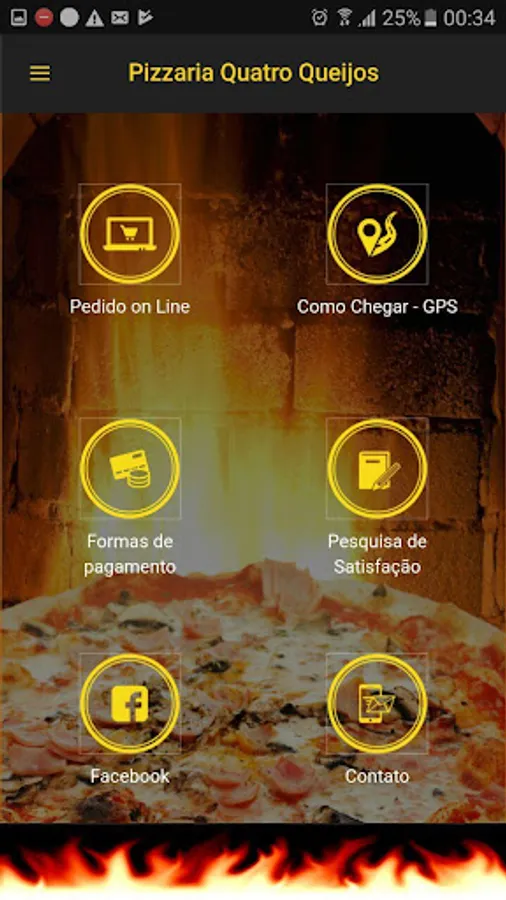 Delivery Application of Four Cheese Pizzeria in Chapecó, SC. PROMOTIONS, Order on Line, As get-GPS, payment forms, Facebook, Contact and others.