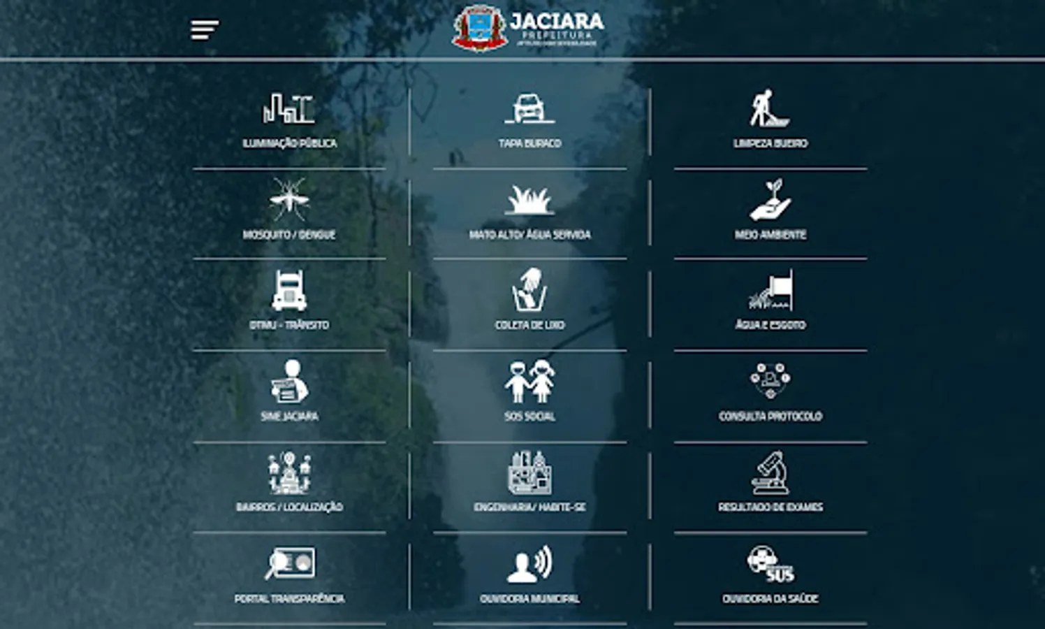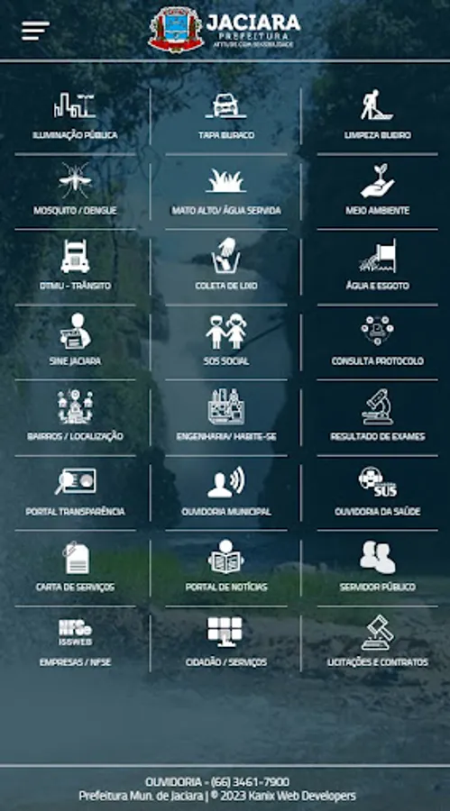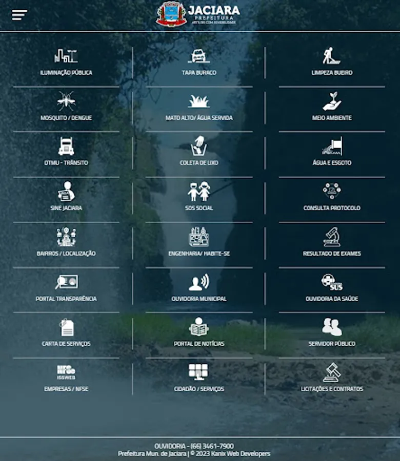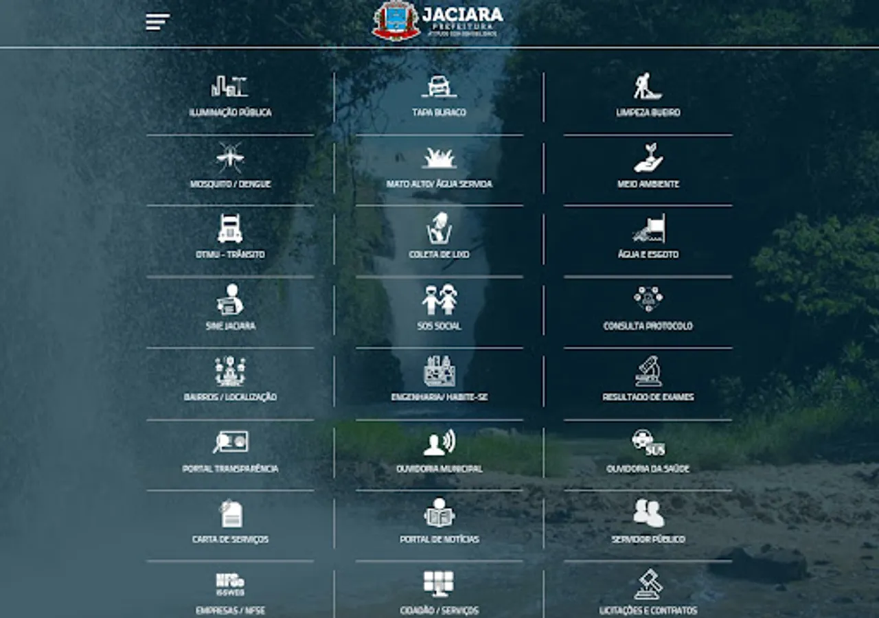 Services Application News and the City of Jaciara - MT. Payslip Online, Invoice Issue Electronic Services, Consultation and issue certificates, 2nd Copy of water bill, Furniture and Real Estate, Transparency Portal, Process Consulting / Protocols, Access to Information and Ombudsman, Procurement and Contracts, Municipal Law, public tender selection process, Organization, Accountability, repair request in street lighting and in water supply and sewage are some of the services available.