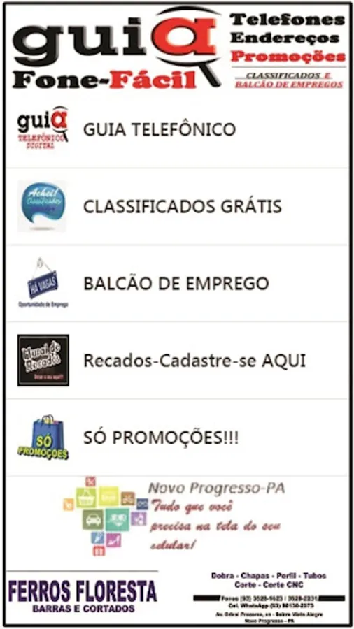 useful application because it contains virtually all numbers from landlines and mobile commercial Novo Progresso / PA. Advertisers include address, logo, photos, maps and promotions ... It also contains work desk flaps and classified.