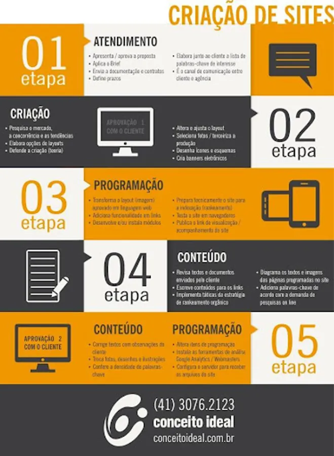 Ao longo de mais de uma década trabalhando com criação de sites, evoluímos muito e hoje temos um processo bem definido para o desenvolvimento destes projetos. Segue abaixo de forma resumida o processo de criação de um site: