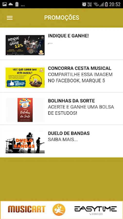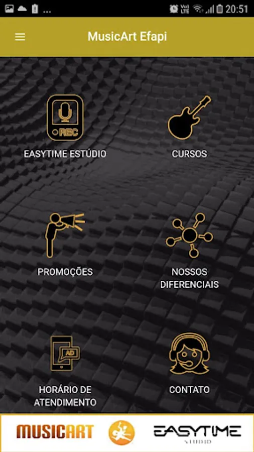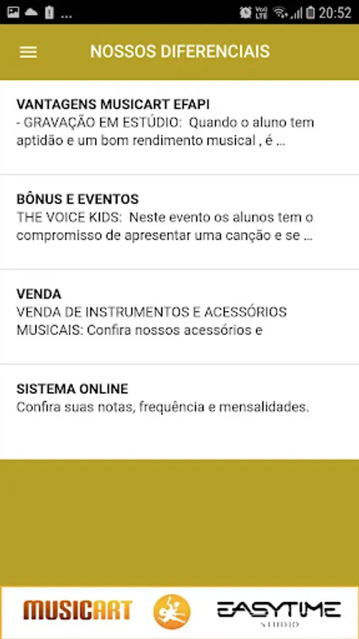 Application School of Music and Studio Easytime Chapecó SC. Promotions, products, social networks, courses, differentials, times, Testimonials, Photos, Videos, Partners, Suggestions, Recording Studio, etc ...