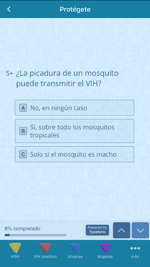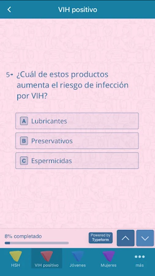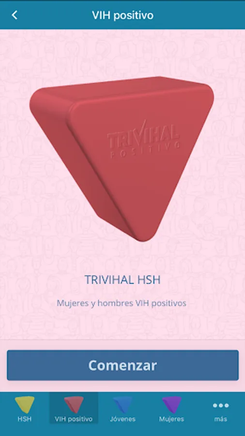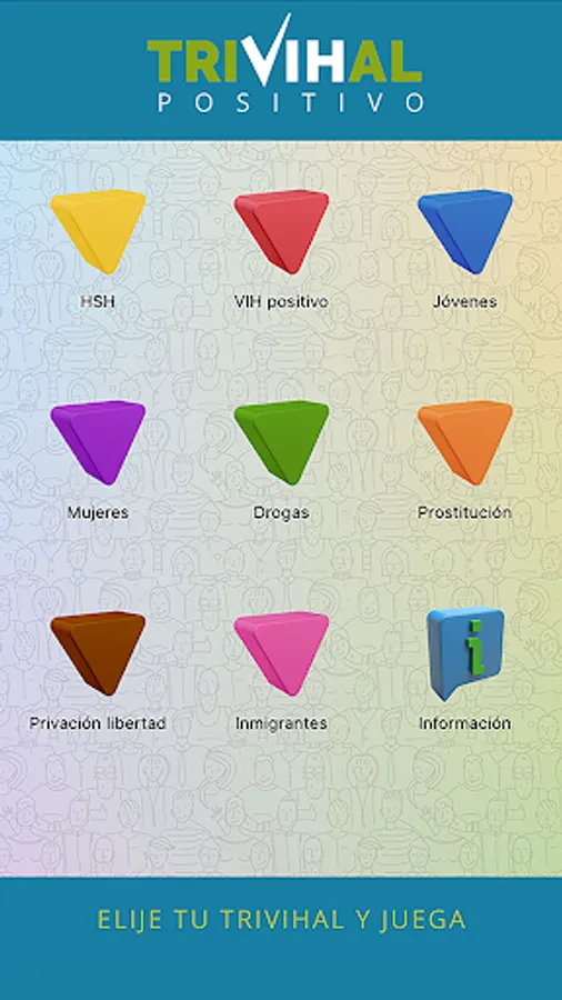 TRIVIHAL POSITIVO is an APP composed of 11 sets of test questions related to HIV with a single valid answer. At the moment of answering the question, the game tells you if you have guessed right or not. In case of failure, it indicates the correct answer, and in both cases provides a brief explanatory comment. Once you finish playing, the application tells you how many questions you have guessed right and you have the possibility to play again to improve your result.
