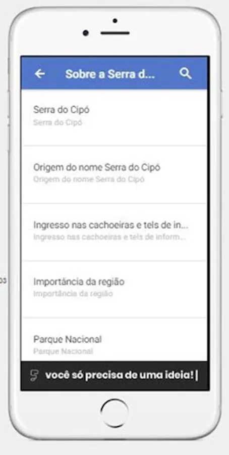 The Serra do Cipó - Guía Application has dozens of services and products divided by categories to facilitate the location in Serra do Cipó. In the application also has the history of Serra do Cipó, all the waterfalls, tourist points and its main information.