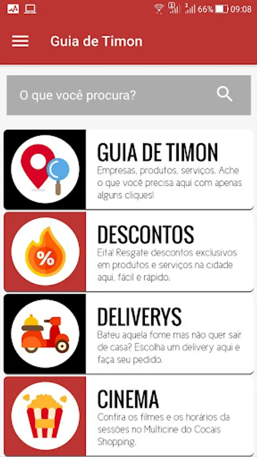The Guide to Timon is a complete guide to the city, which brings as attractive super discounts on local businesses, deliverys options, movies on show, city spas, events and parties that are happening, job vacancies, buying and selling, plus news and more. Download right now and have everything in the pocket about the city of Timon-MA.