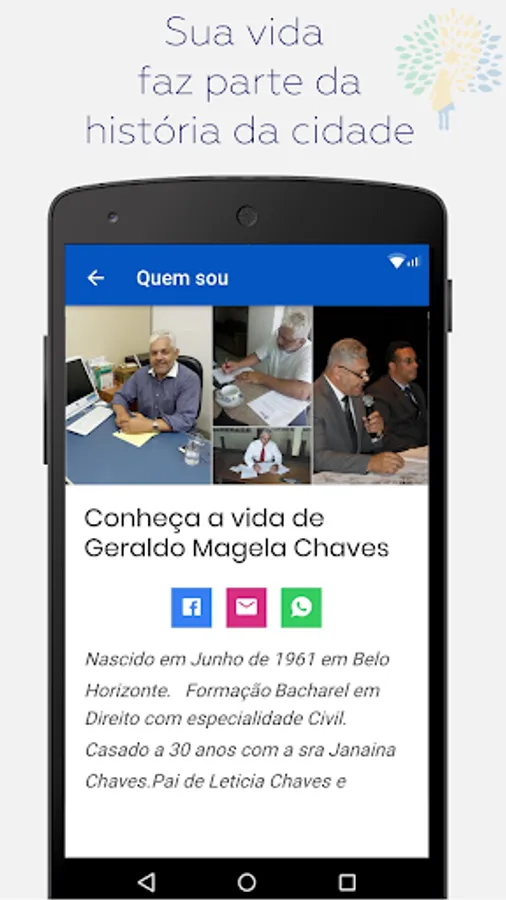 In the App you will find everything about the personal family life of Dr. Geraldo Magela, children, grandchildren, and his professional career as a lawyer, councilor and mayor.
