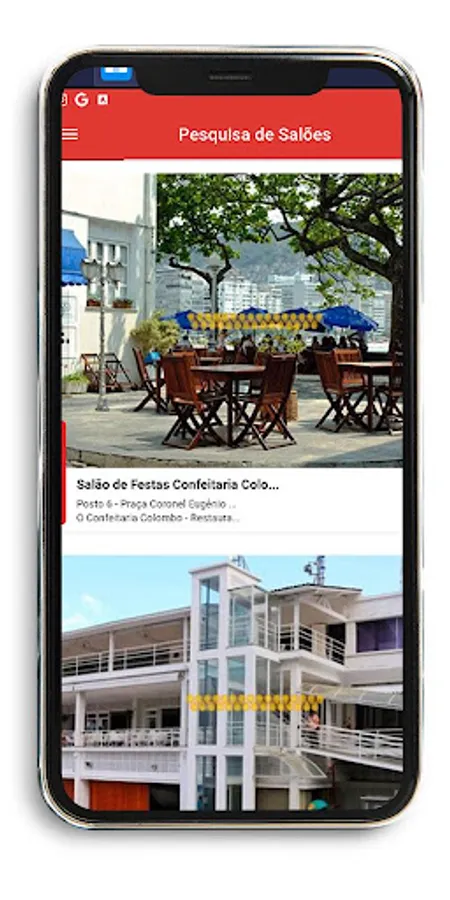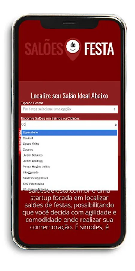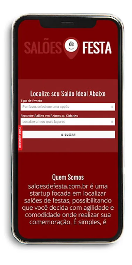 App focused on researching lounges and parties with photo resources, structure information and budget requests. The search is done according to the type of event and the location desired by the user. Ex .: Children's party in Copacabana, the result is specific to a party house that allows the organization of children's parties in the neighborhood, streamlining the search for the ideal space for the event.