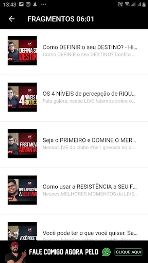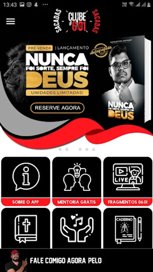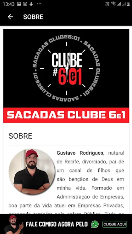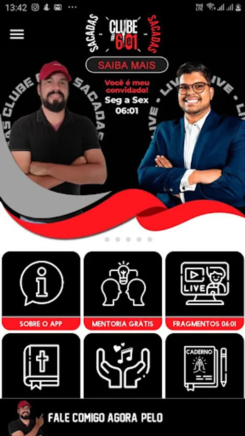 Then, the App "Sacadas Clube6e1" appears, with summaries and insights from Lives and Mentories that happen from Monday to Friday at 06:01.